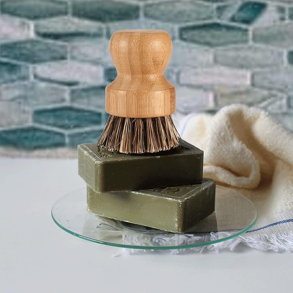Bamboo Scrub Brush Clean Pan, Dish and Vegetable, Natural Bristles Palm Pot Brush 4 Pack Round Mini Dish Brush with Ceramic Holder for Kitchen Sink Cleaning