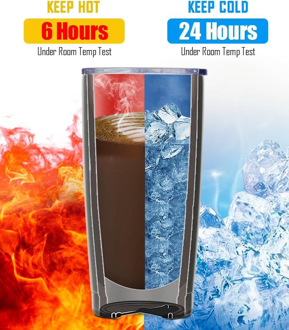 • Insulated 20 oz Coffee tumbler: Double-wall vacuum insulation technology, keep drinks hot for over 6 hours and cold for around 24 hours, sweat proof, no condensation
