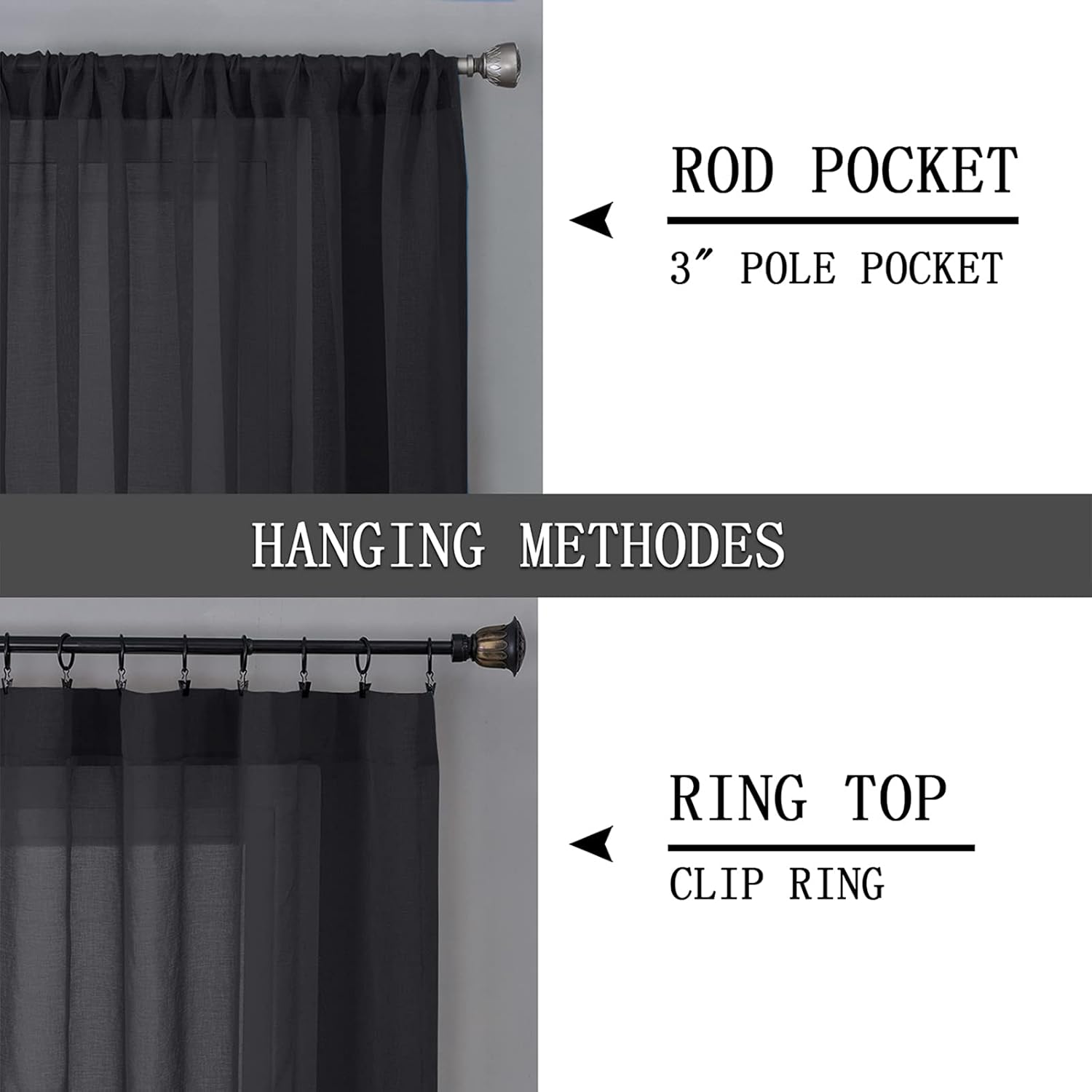 • Light Filtering: The linen look black sheer curtains can allow the right amount of natural light through to bring your room a hazy and softer vision, keep you away from someone’s glance from outside and provide you some privacy.