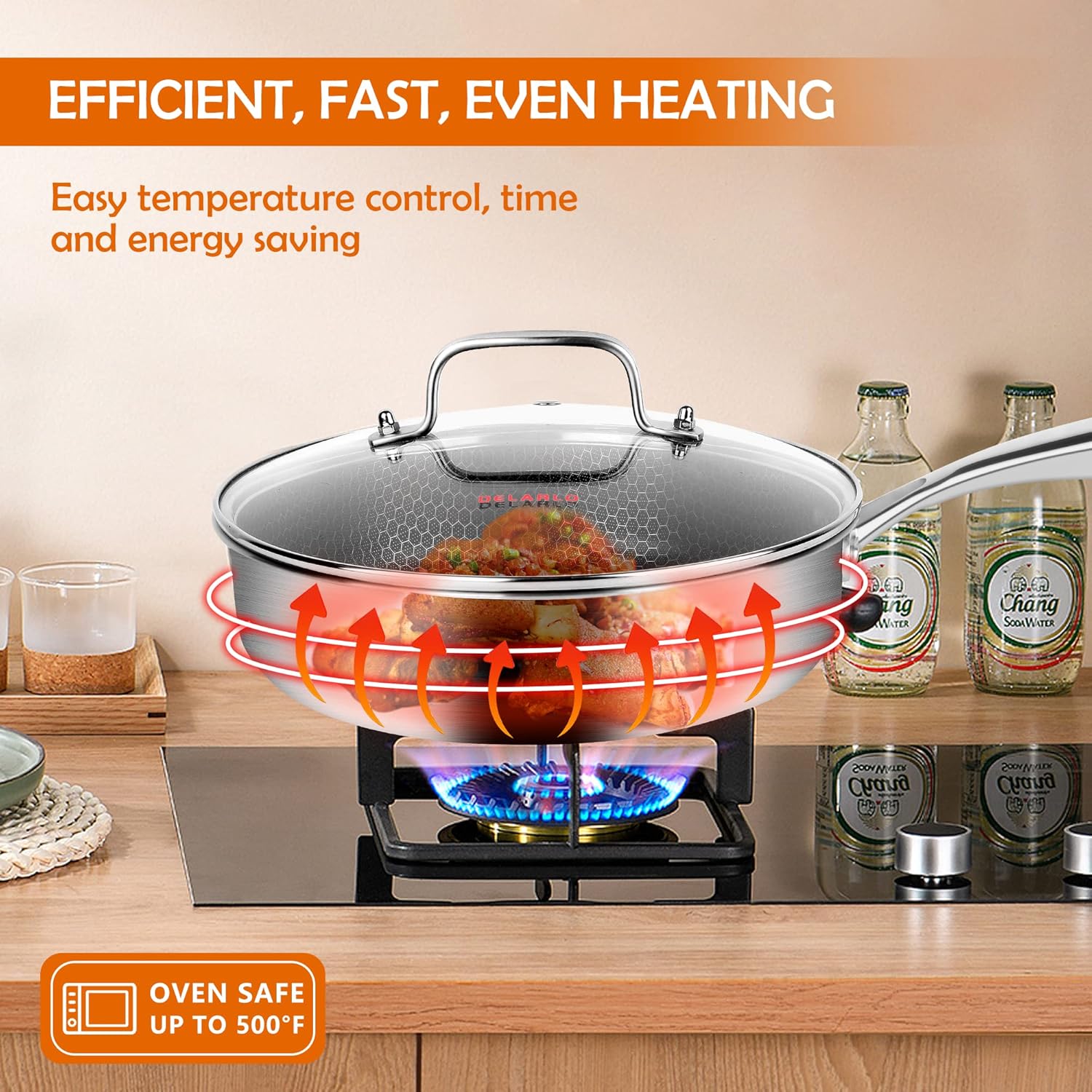 • 【HEALTHY MATERIAL】DELARLO Saute Pan are made up of high-quality ​stainless steel, which is highly durable, corrosion-resistant, and does not react with food to ensure healthy cooking