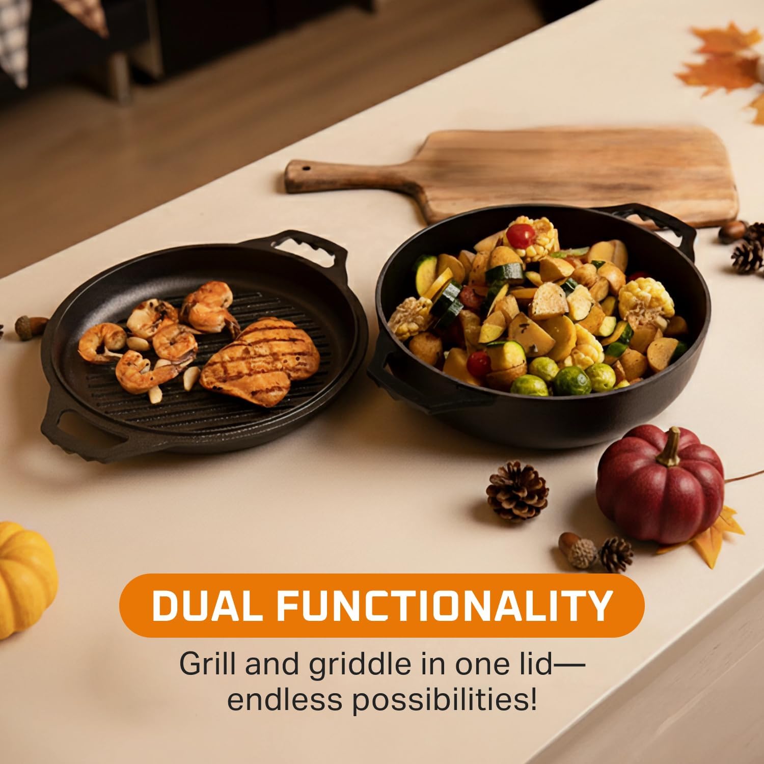 • Dual Function Lid: The grill lid doubles as a griddle for pancakes, eggs, or grilling; great for adding versatility to your cookware collection without extra tools; cast iron retains heat for even cooking