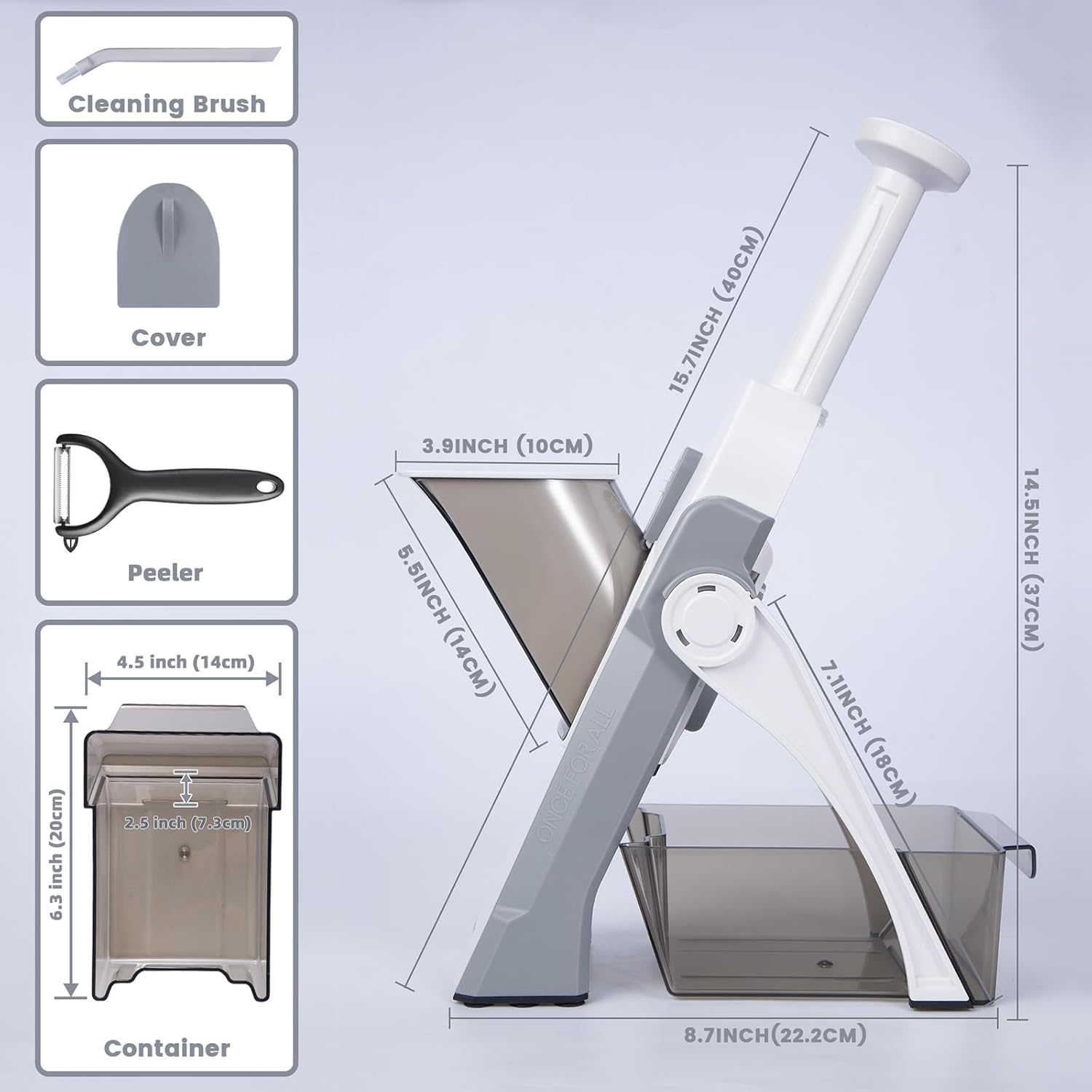 • EASY TO USE: First, place the food in the chute, and then simply push the handle to quickly obtain the desired shape - slices, strips, julienne, or dices. The slice thickness can be adjustable from 0.1 to 8mm, great for potatoes, carrots, tomatoes, cucumbers, and more.
