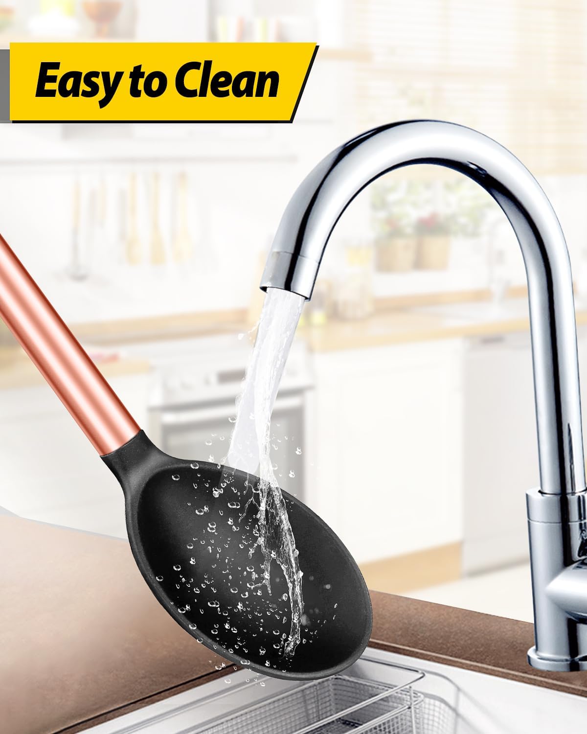 Pack of 2 Large Silicone Cooking Spoons,Non Stick Solid Basting Spoon,Heat-Resistant Kitchen Utensils for Mixing,Serving,Draining,Stirring (ROSE GOLD BLACK)