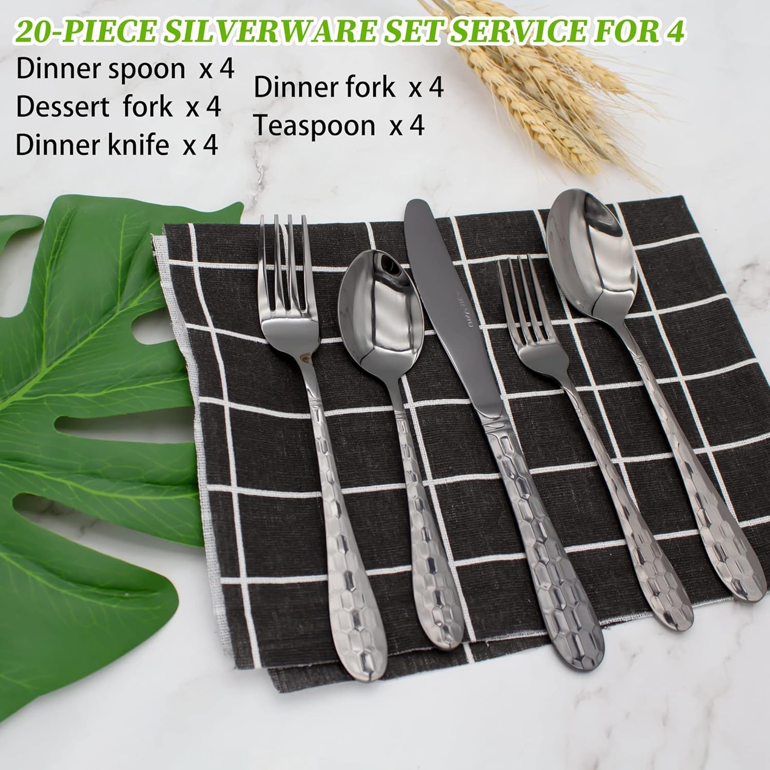 • 🌟🍴【20 PCS SILVERWARE SET SERVICE FOR 4】This silverware set includes 4 dessert fork, 4 dessert spoons, 4 dinner forks, 4 dinner spoons, and 4 dinner knives, 20 pieces silverware set can satisfy most family of 4 people and provide sufficient quantities for the guest.Dishwasher safe eating utensils.