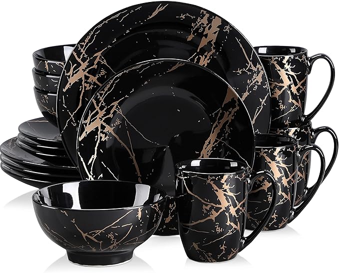 • 【Dinnerware Sets for 4】 16-piece porcelain dish set patterned gold with 4 x 10.4" Dinner Plate, 4 x 8.5" Dessert Plate, 4 x 6.1" (22oz) Soup Cereal Bowl and 4 x 13oz Mug