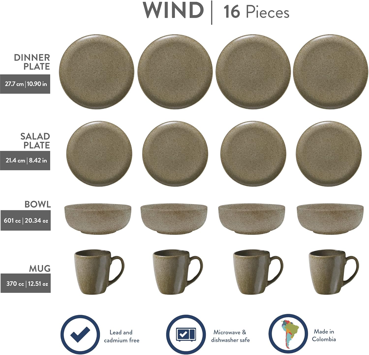 Corona 16–piece Unique Finish Earth-Toned Ceramic Dinnerware Sets, Plates, Bowls and Mugs, Service For 4, Wind