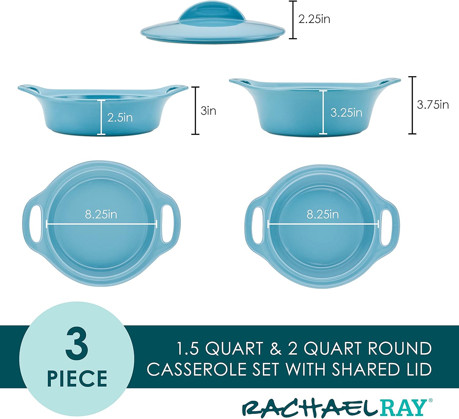 Rachael Ray Solid Glaze Ceramics Casserole Bakeware/Baker Set with Shared Lid, 3 Piece, Agave Blue