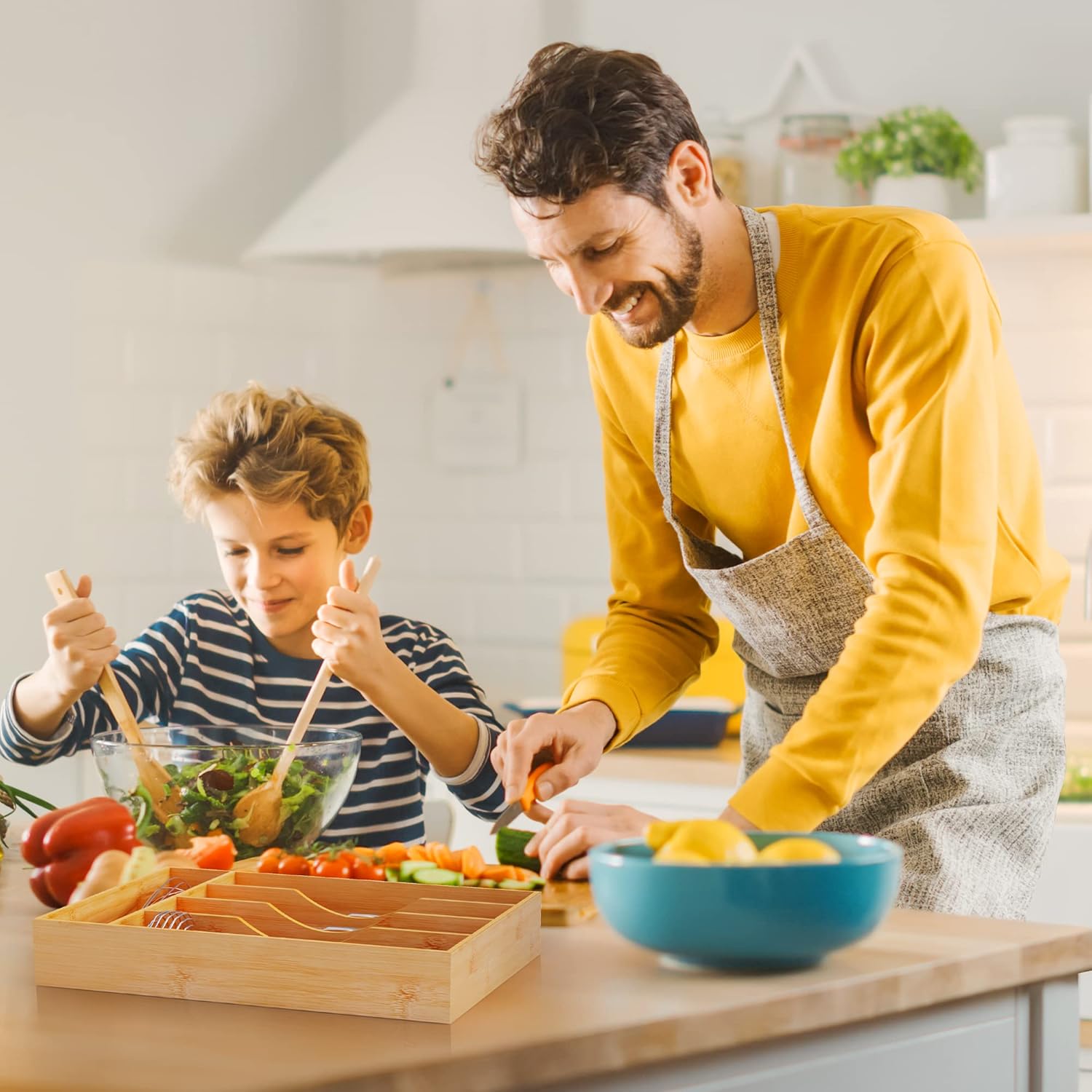 • 【Made of natural bamboo】Our flatware organizer is made of natural bamboo. The material is taken from bamboo that have grown for more than 4 years which make our silverware holder for drawer use a durable kitchen piece that ll last you for years. The Environmentally material keep our flatware & utensil water and odor resistant. Even the knife won't leave scratch on it.