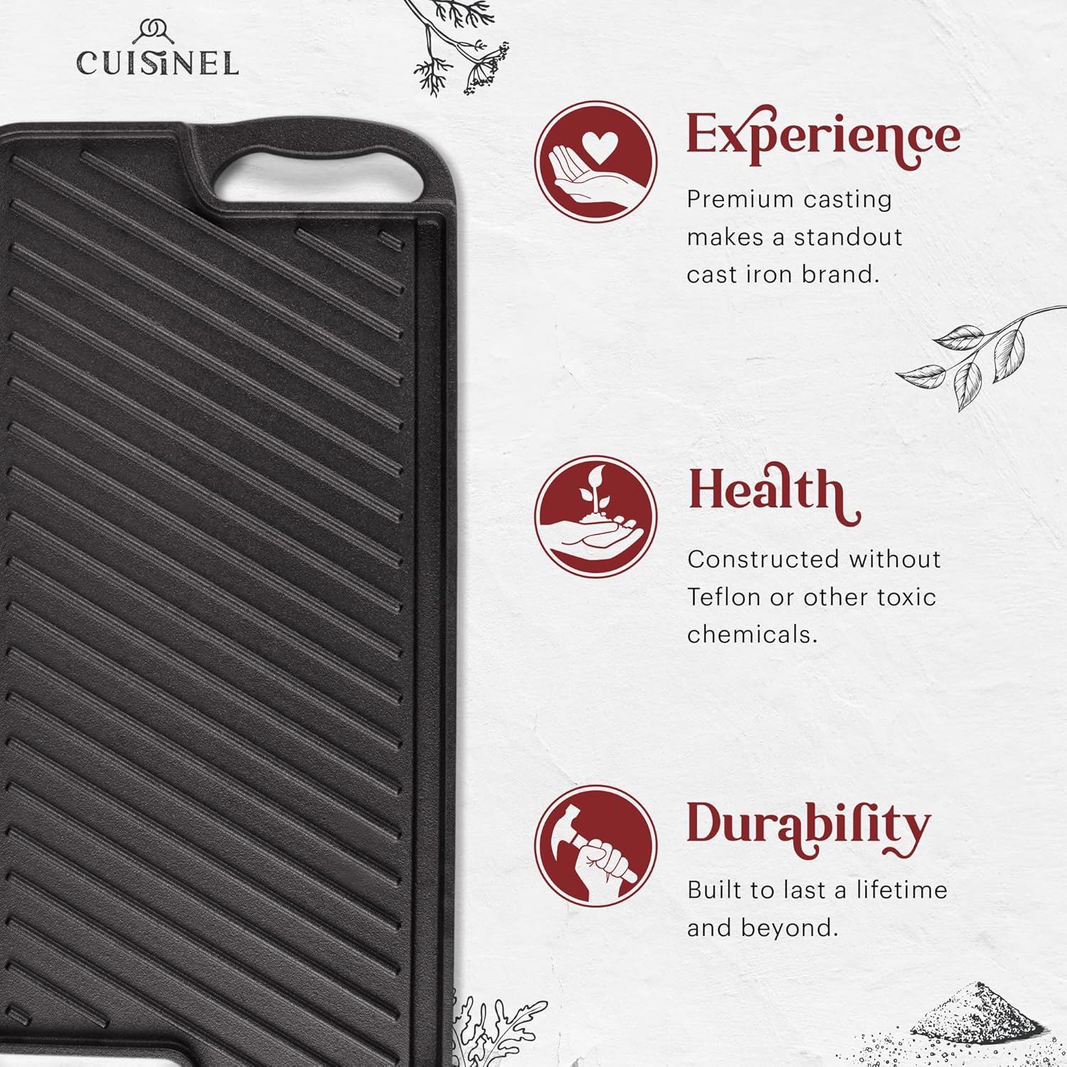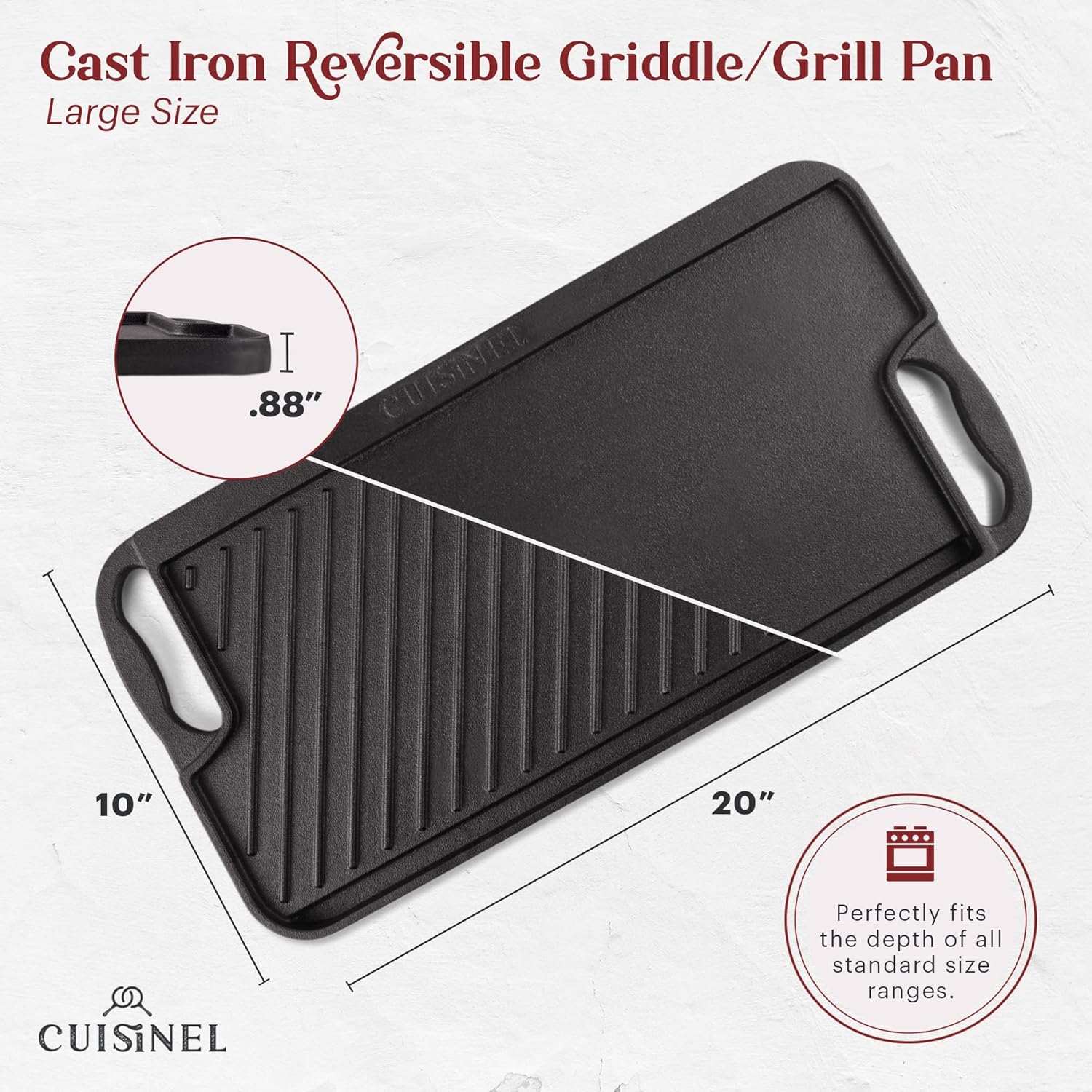 Cuisinel Cast Iron Griddle/Grill + Scraper/Cleaner - Reversible Pre-Seasoned 20" X 10"-inch Dual Handle Flat Skillet and Griller Pan + Cleaning Accessories - Use Indoor/Outdoor Stove Top Burner, Gas