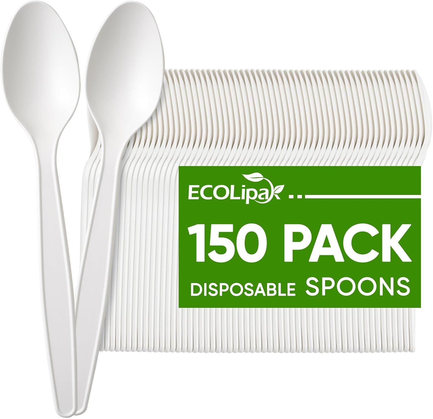 ECOLipak 150 Pcs White Disposable Spoons, 6.7 Inch Large Size Heavy Duty No Plastic Spoons for Party, BBQ, Picnic