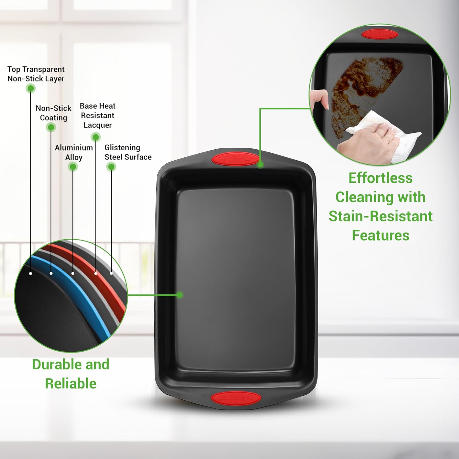 • HEATPROOF SILICONE HANDLES: The commercial grade restaurant quality kitchen bakeware features red silicone handles to prevent accidental burns. Also stain-resistant, easy to clean & dishwasher safe but hand washing is recommended to extend pan life