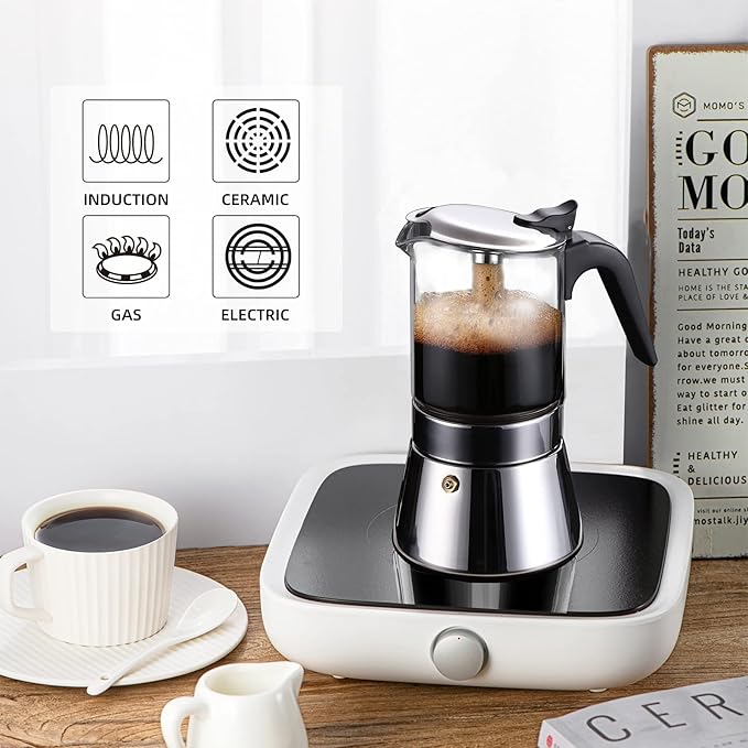 Moka Induction Stovetop Espresso Maker With Pressure valve,Crystal Glass-top & Stainless Steel Esprosso Moka Pot,240ml Classic Italian Coffee Maker