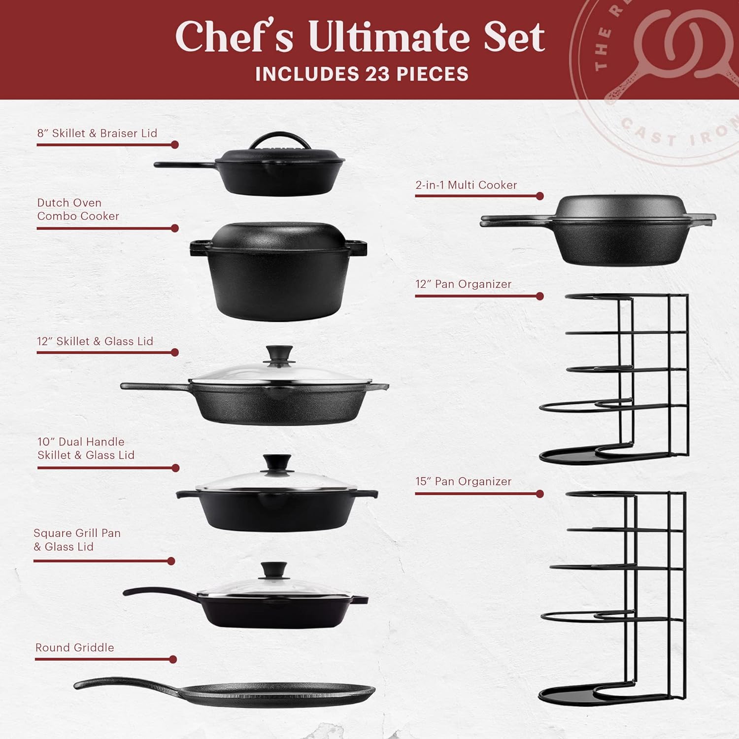 • CHEF'S COMPLETE SET: 8" Skillets with Cast Iron Lid + 10" Dual Handle Braiser Pan with Glass Lids + 12" Skillet with Glass Lid + 10.5" Square Grill Pan with Glass Lid + 10.5" Round Flat Griddle + 2-in-1 Multi-Cooker + 12" and 15" Panracks + Silicone Handle Grips for everything AND Pan Scraper for easy clean-up: This overwhelming selection provides you with the full array of cookware, keeping you equipped for all culinary endeavors!