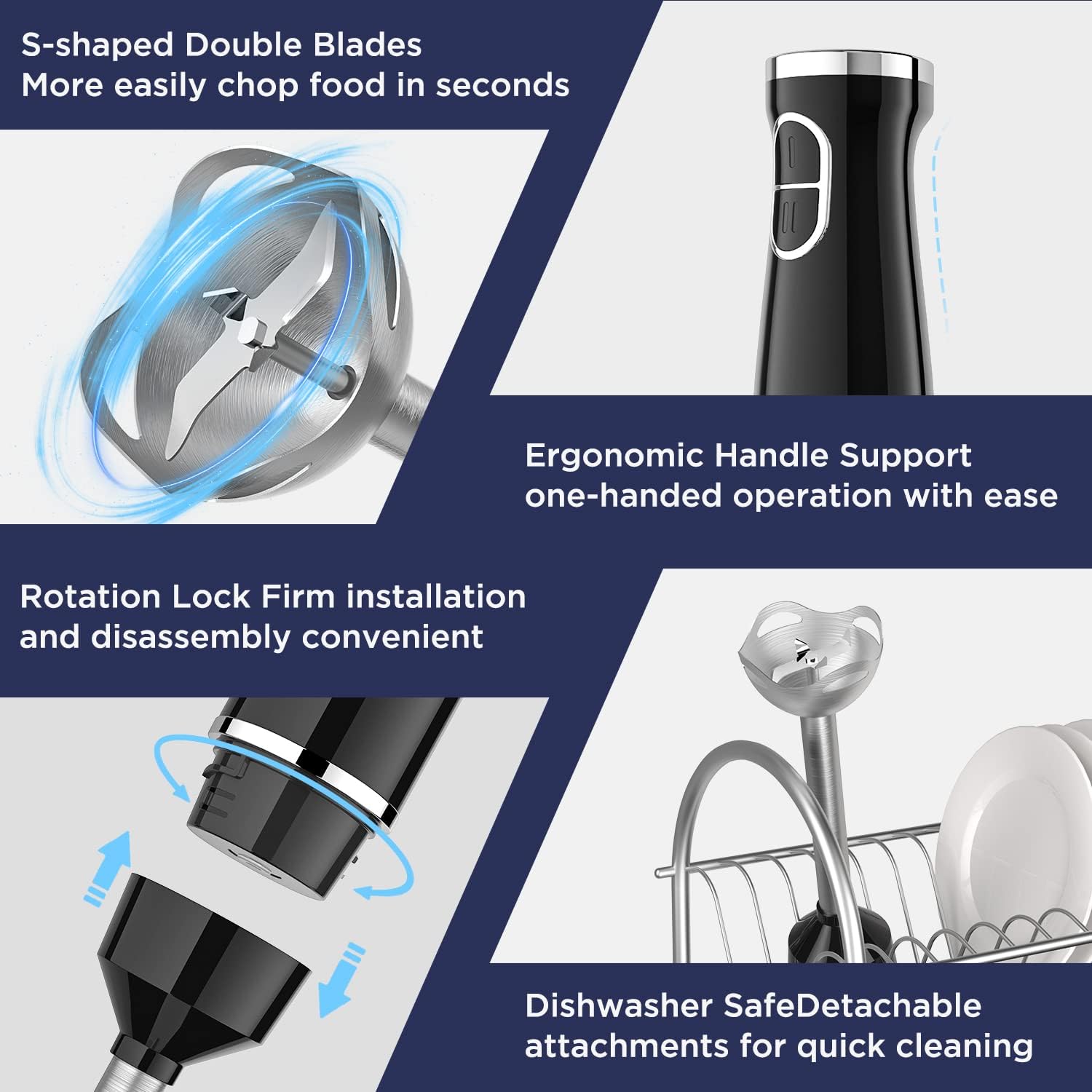 • Versatile Design: 4-in-1 multifunctional hand blender system includes immersion blender, food processor, and mixing accessories for complete kitchen functionality