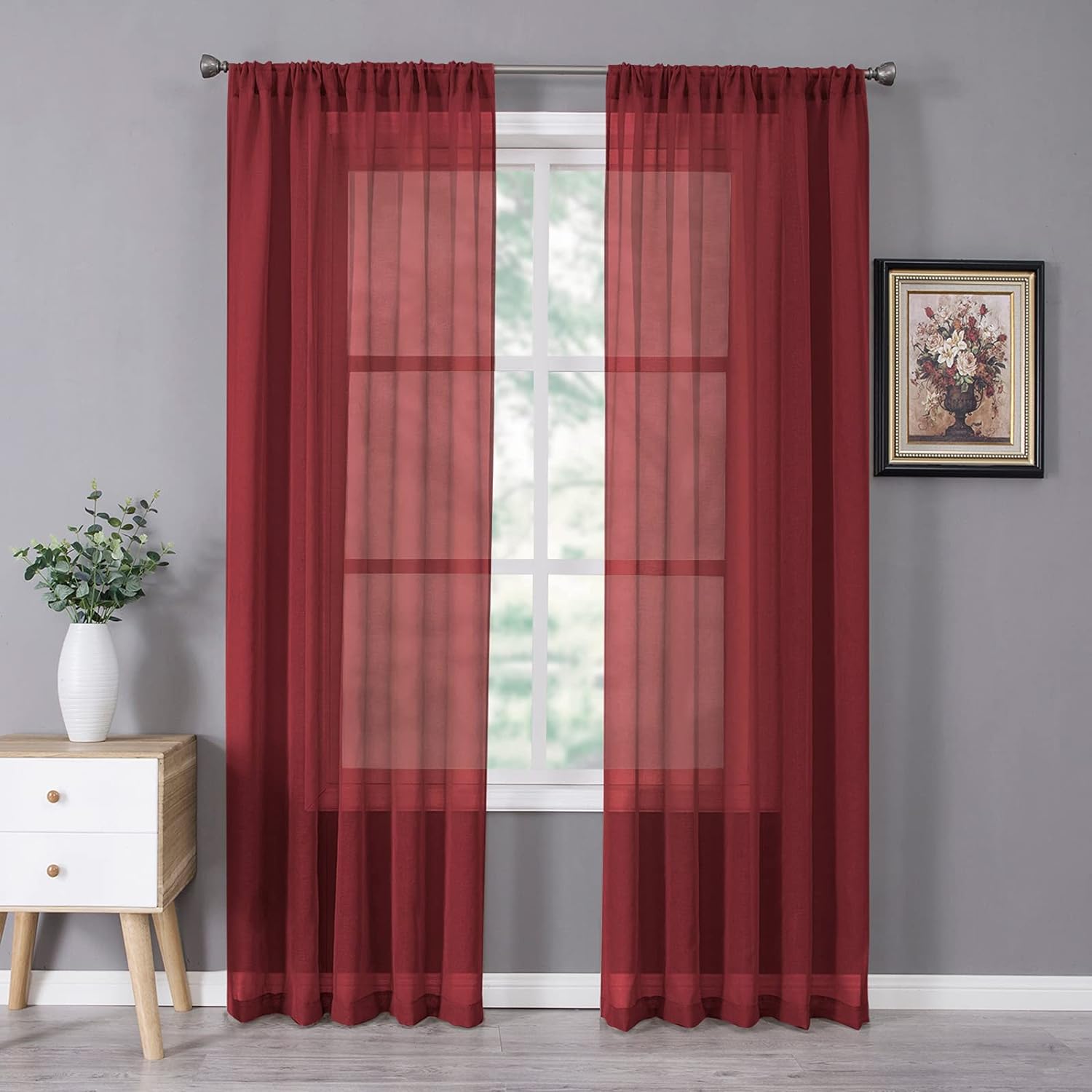 Tollpiz Sheer Curtain Linen Textured Bedroom Curtains Sheer Light Filtering Rod Pocket Voile Curtain for Living Room, 54 x 95 inches Long, Burgundy Red, Set of 2 Panels