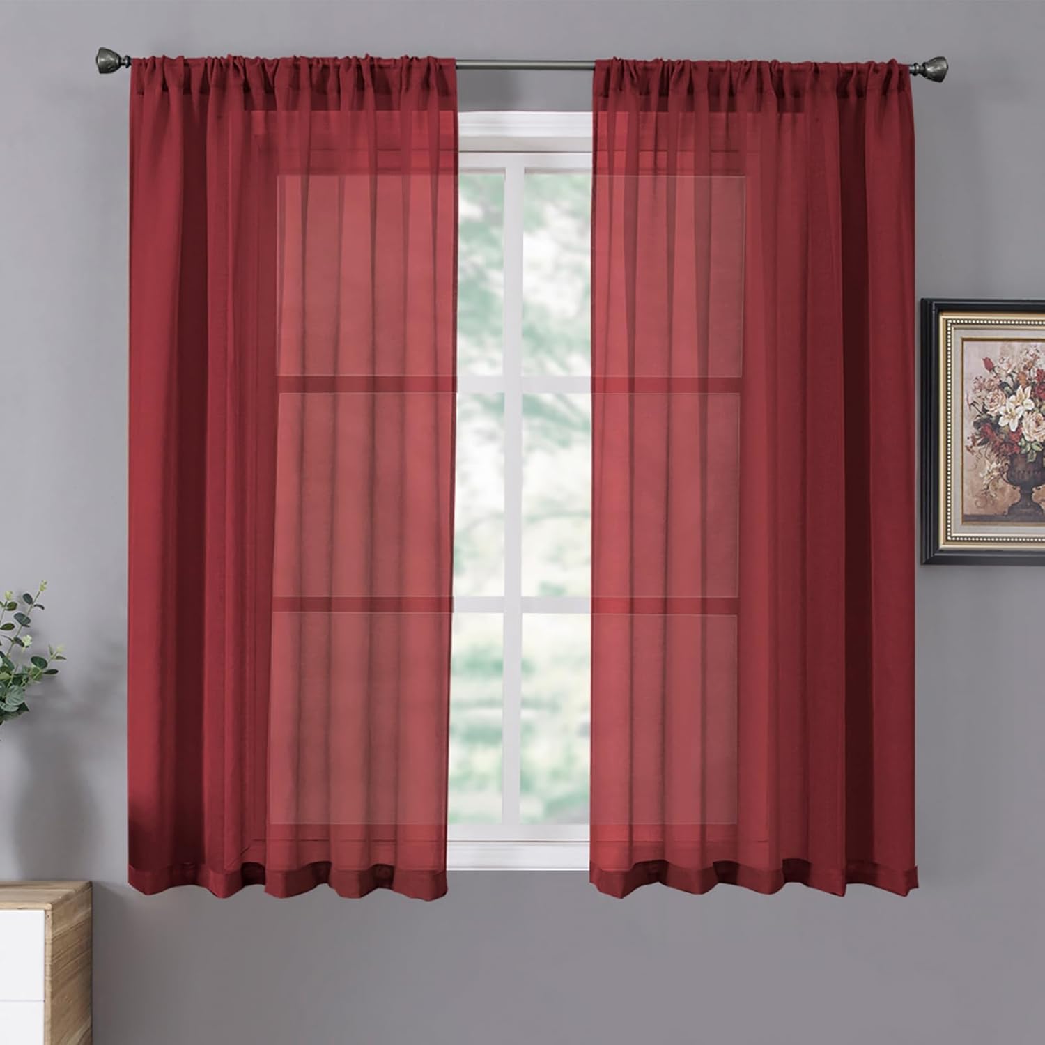 Tollpiz Short Sheer Curtain Linen Textured Bedroom Curtains Sheer Light Filtering Rod Pocket Voile Curtain for Living Room, 54 x 54 inches Long, Burgundy Red, Set of 2 Panels