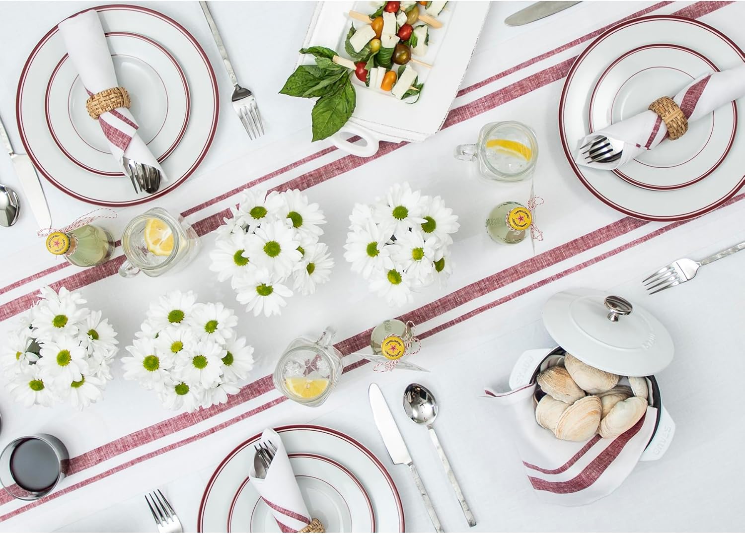 Solino Home Linen Table Runner 72 Inches Long - 100% Pure Linen Burgundy and White French Stripe Table Runner 14 x 72 Inch for Dining, Dresser, Fall, Autumn, Halloween, Thanksgiving