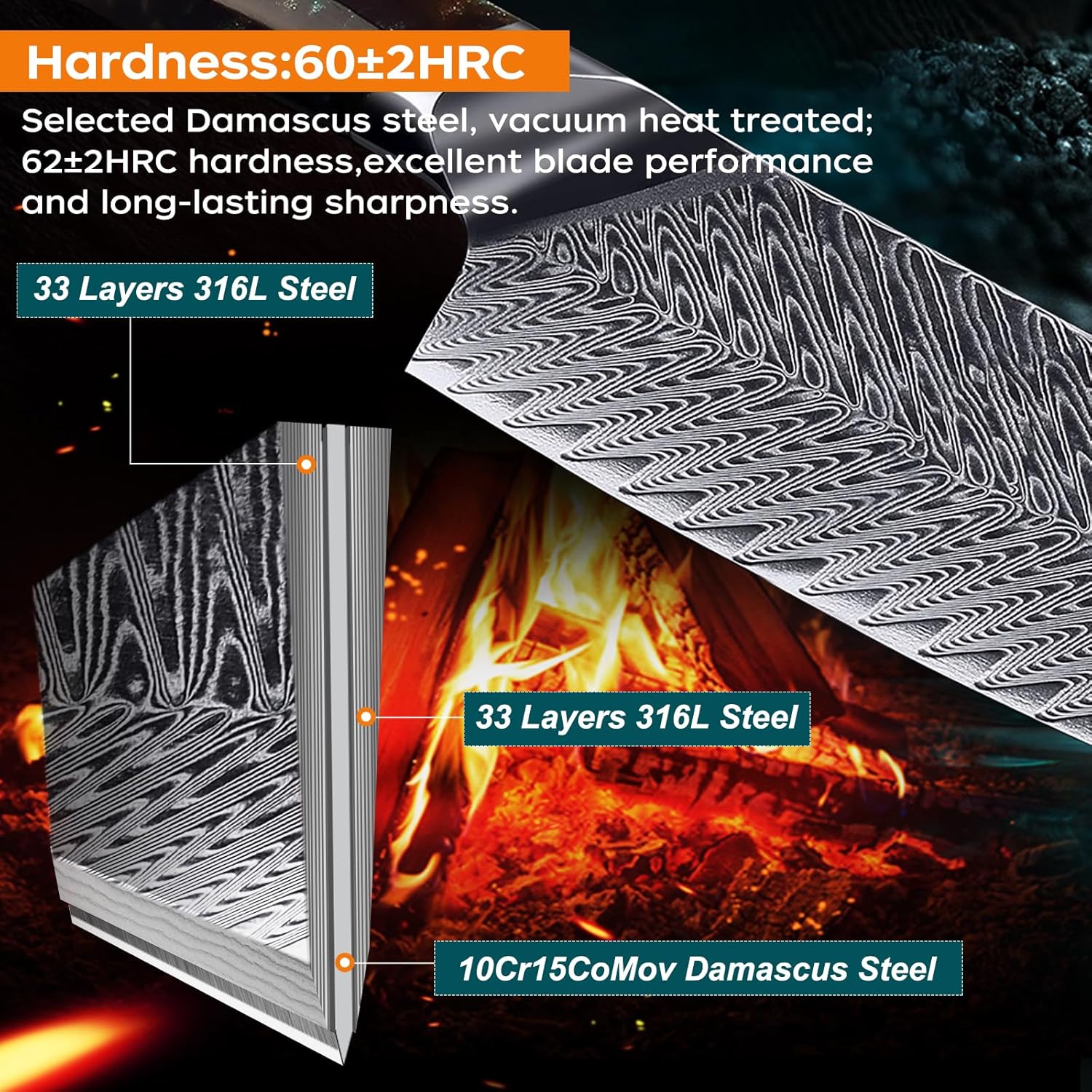 • Advantages - Our knife was made of 10Cr15CoMov, which is a Chinese stainless steel equivalent to Japanese VG10 steel. 10Cr15CoMoV steel has a hardness of 59-62 HRC as per the Rockwell hardness scale. It keeps a sharp edge and the ability to resist abrasion. 10Cr15CoMoV contains enough chromium to fight corrosion, it does not easy to rust. It can be effectively used in humid, wet, and salty environments. Proper care for this steel is as simple as cleaning and drying the blades after use.
