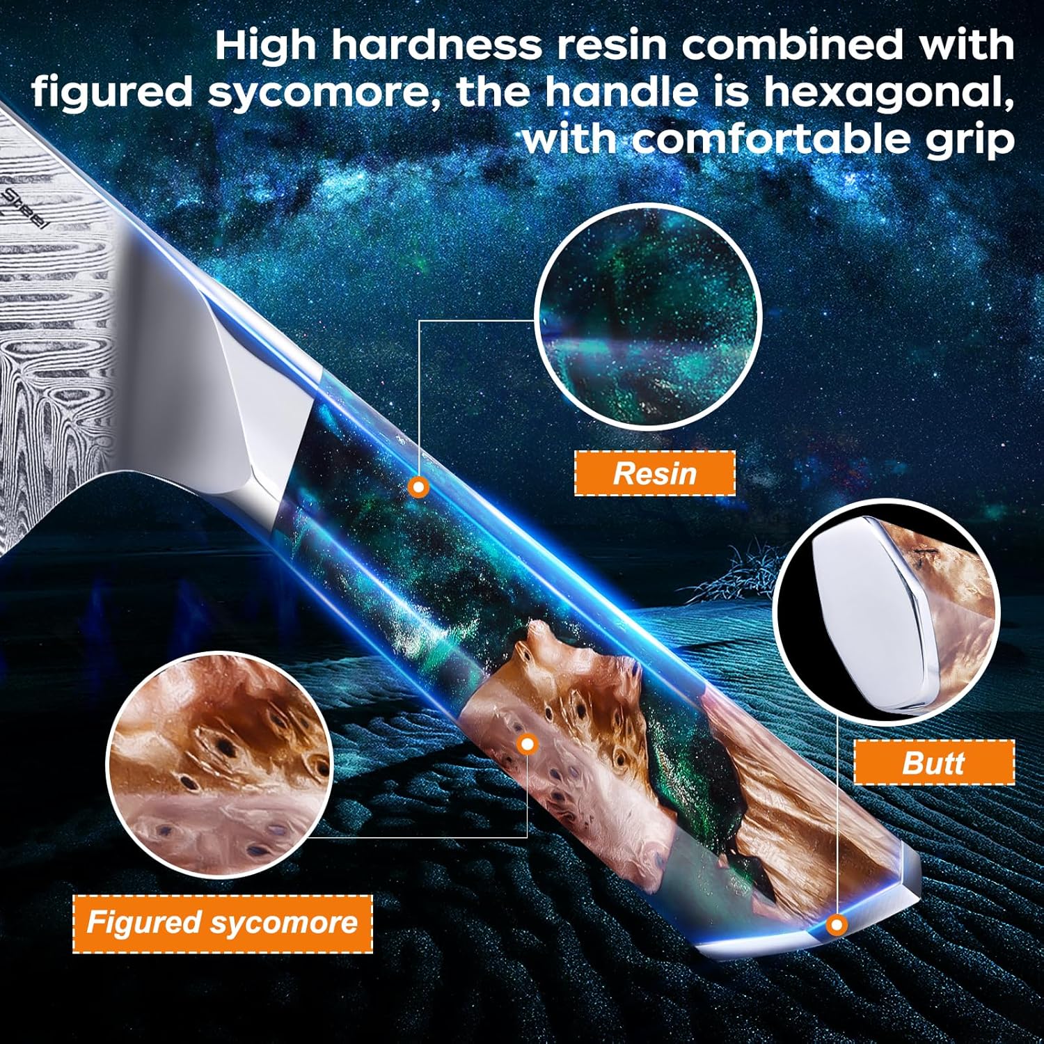 • Material - The blade was constructed of 10Cr15CoMov Damascus steel. Premium metal, sharp and durable, not easy to rust. Handle was made of blue Resin and Figured Sycamore wood. A unique design, elegant and exquisite.