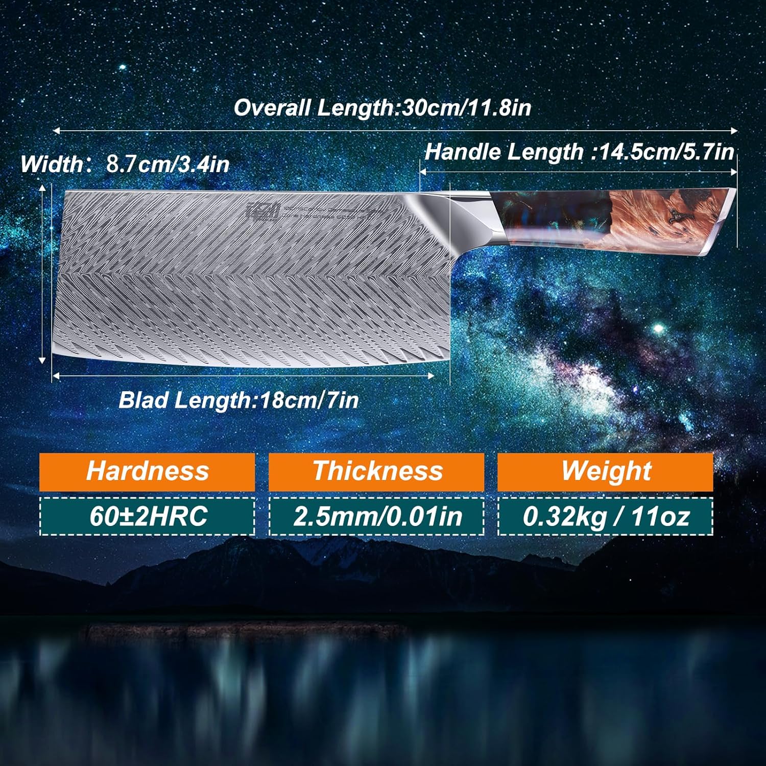 FINDKING Nebula Series Cleaver Knife, Multipurpose Chinese Chef Knife, 10Cr15CoMov Damascus Steel Blade, Resin and Figured Sycamore Handle, Full Tang, 7 Inch, Blue, for Meat, Vegetable Shredding