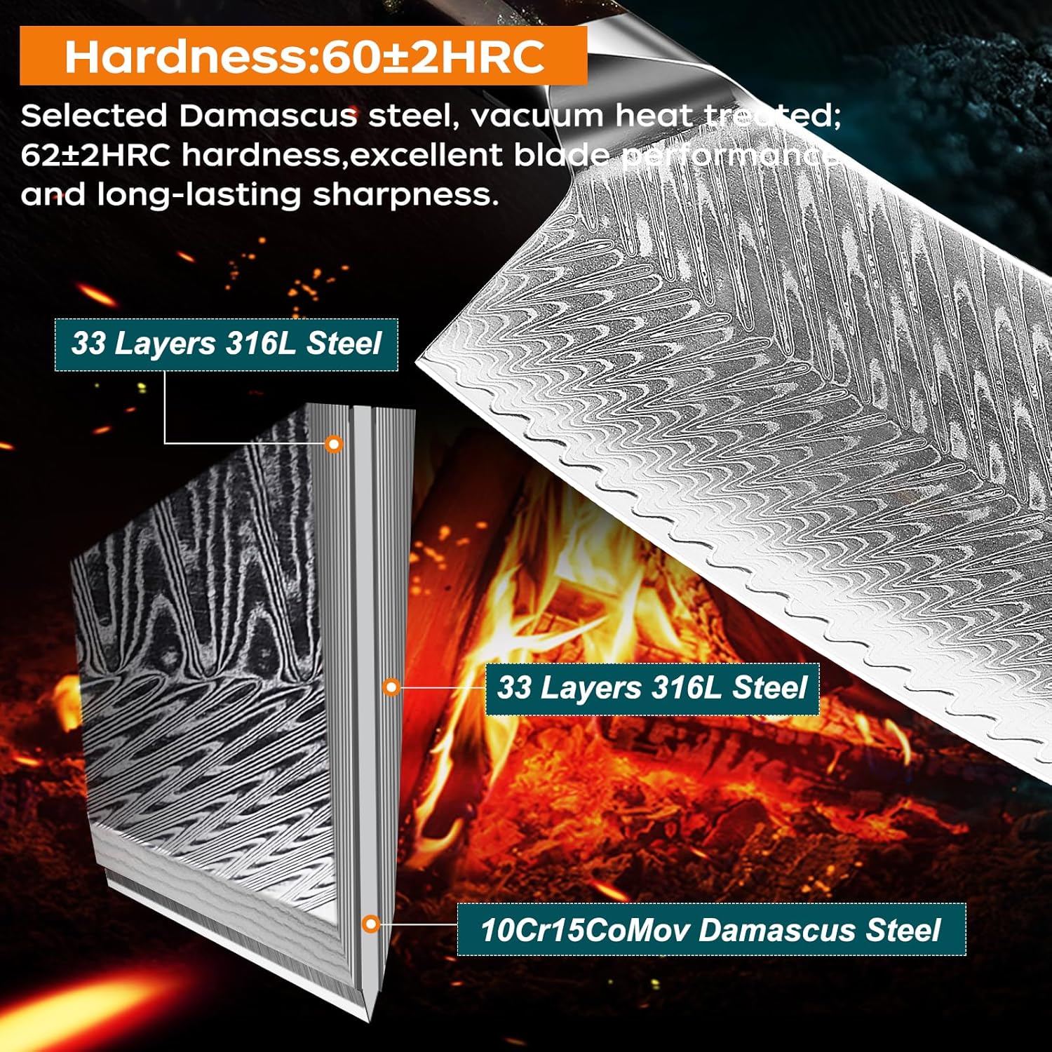 • Advantages - Our knife was made of 10Cr15CoMov, which is a Chinese stainless steel equivalent to Japanese VG10 steel. 10Cr15CoMoV steel has a hardness of 59-62 HRC as per the Rockwell hardness scale. It keeps a sharp edge and the ability to resist abrasion. 10Cr15CoMoV contains enough chromium to fight corrosion, it does not easy to rust. It can be effectively used in humid, wet, and salty environments. Proper care for this steel is as simple as cleaning and drying the blades after use.