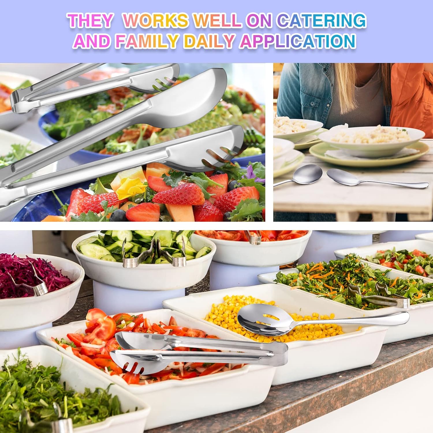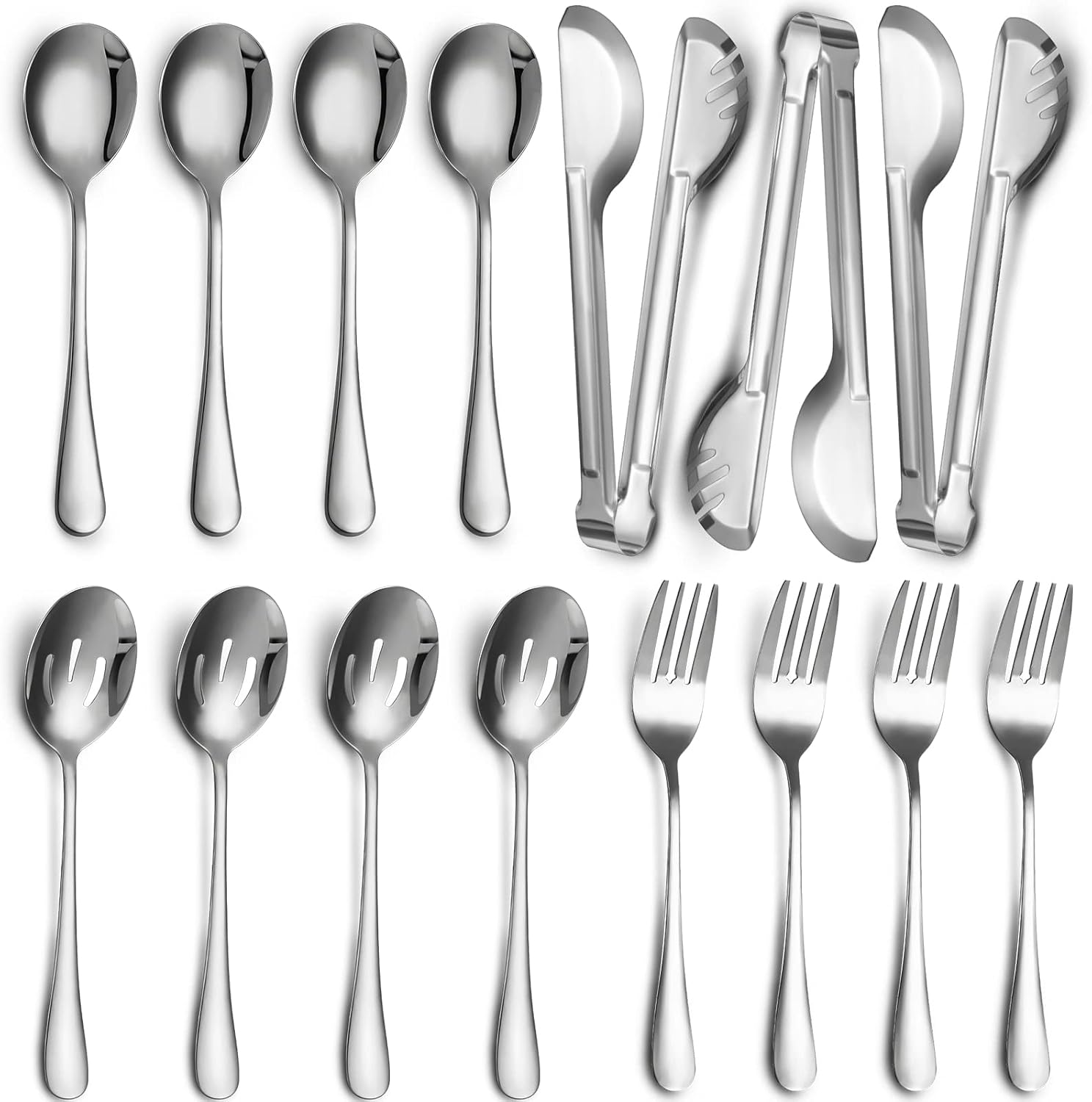 • Package includes: you will receive 15 pieces stainless steel serving utensils in total, including 3 pieces 9.45 inch tongs, 4 pieces 8.7 inch slotted serving spoons, 4 pieces 8.7 inch serving spoons and 4 pieces 9 inch serving forks, abundant quantity and chooses to satisfy your family daily application