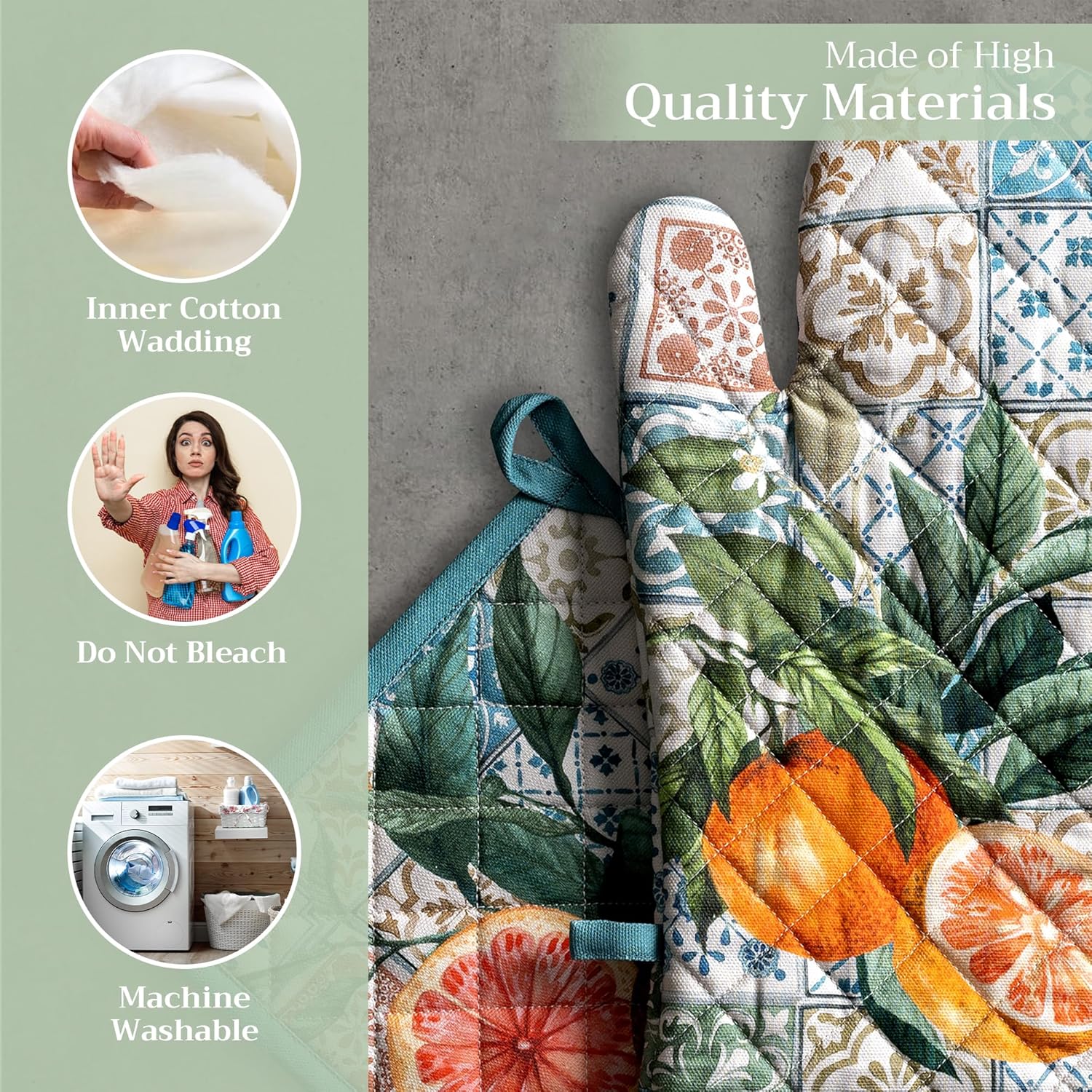 Maison d' Hermine 100% Cotton Oven Mitt & Pot Holder Set (7.5"x13" & 8"x8") Heat Resistant BBQ Cooking Gloves with Loop, Baking, Grilling, Kitchen, Handling Hot Pans Spring/Summer (Agrume)