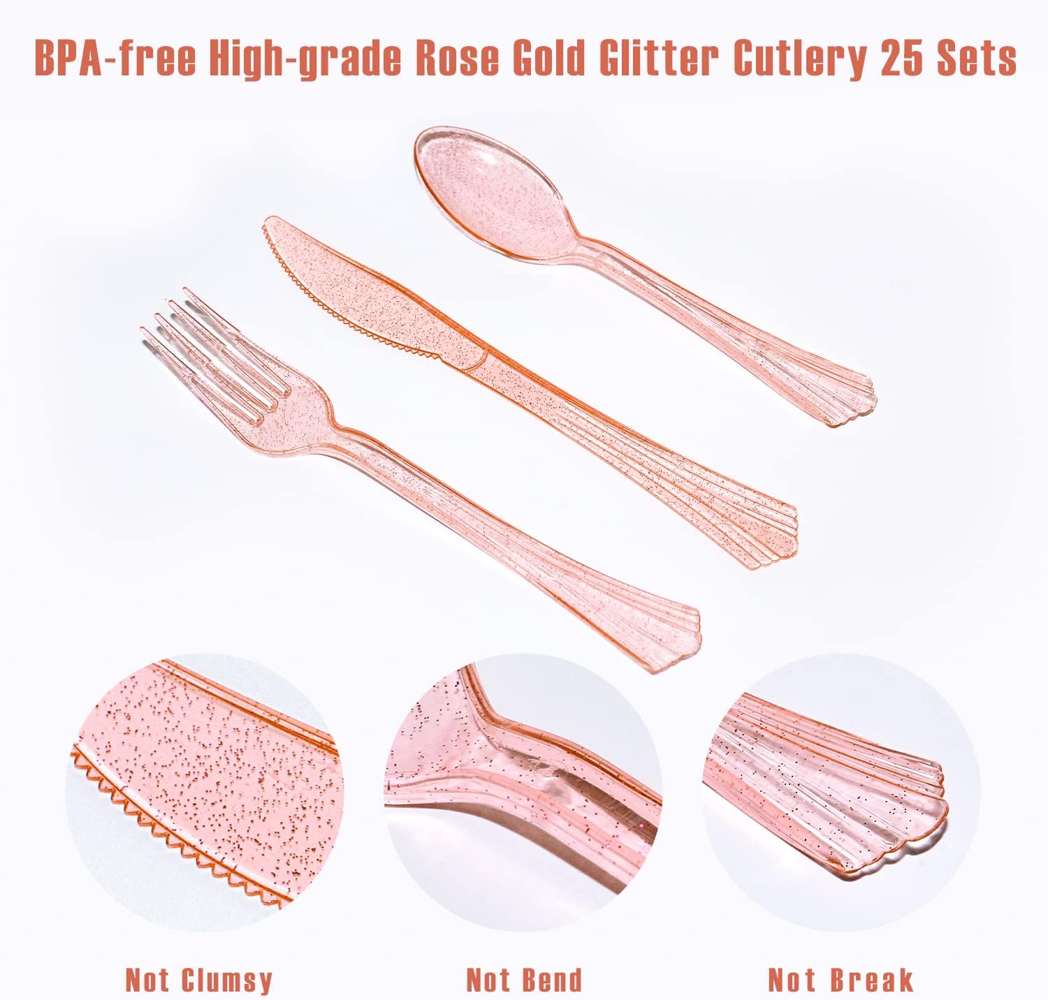 • ✔「Sever for 25 Guests」 This party dinnerware set including 9" dinner paper plates *25, 7" paper dessert plates *25, 9oz paper cups *25 and luncheon napkins (3-ply, 6.5" x 6.5") *25, 25 sets of heavy duty rose gold glitter plastic cutlery (25 forks, 25 spoons, 25 knives)