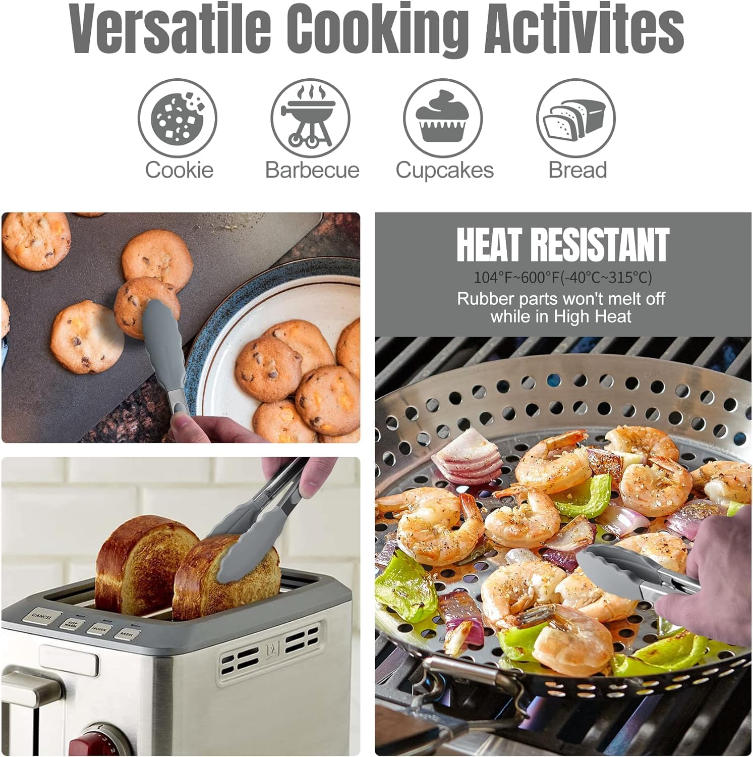 • EASY TO USE: The cooking tongs' handle is cushioned with silicon, good for thumb rest and ensures good grip and control. The Food Grade silicon tongs tip is heat resistance 600°F and less prone to scratch the pan. Easy to rinse, dishwasher safe.