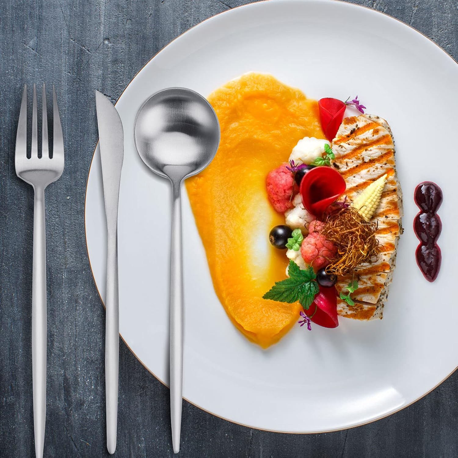 • ★ Modern silverware set--This eating utensils sets have the slim profiles and pointed stems, is a sophisticated take on minimalist design. The silver kitchen utensils set includes everything you need for a formal full-course meal. They can match your modern dinnerware set and dish set perfectly.