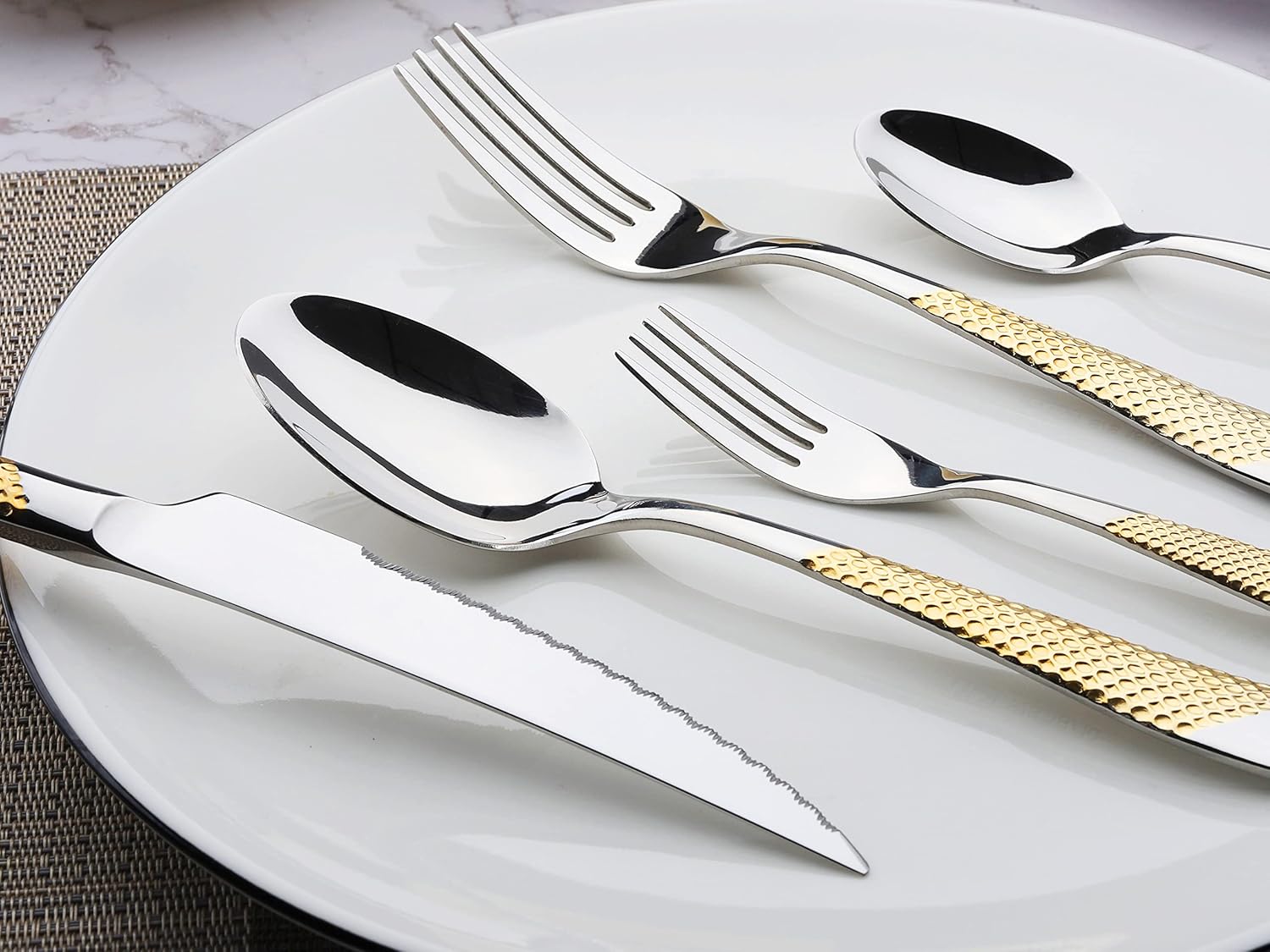 • 【Simple Desgin】The embossed pattern on the handle is a major feature of this cutlery set.The gold-plated process is adopted. The concave-convex pattern makes you not slippery in use. The design of the whole set of flatware looks simple and fashionable.