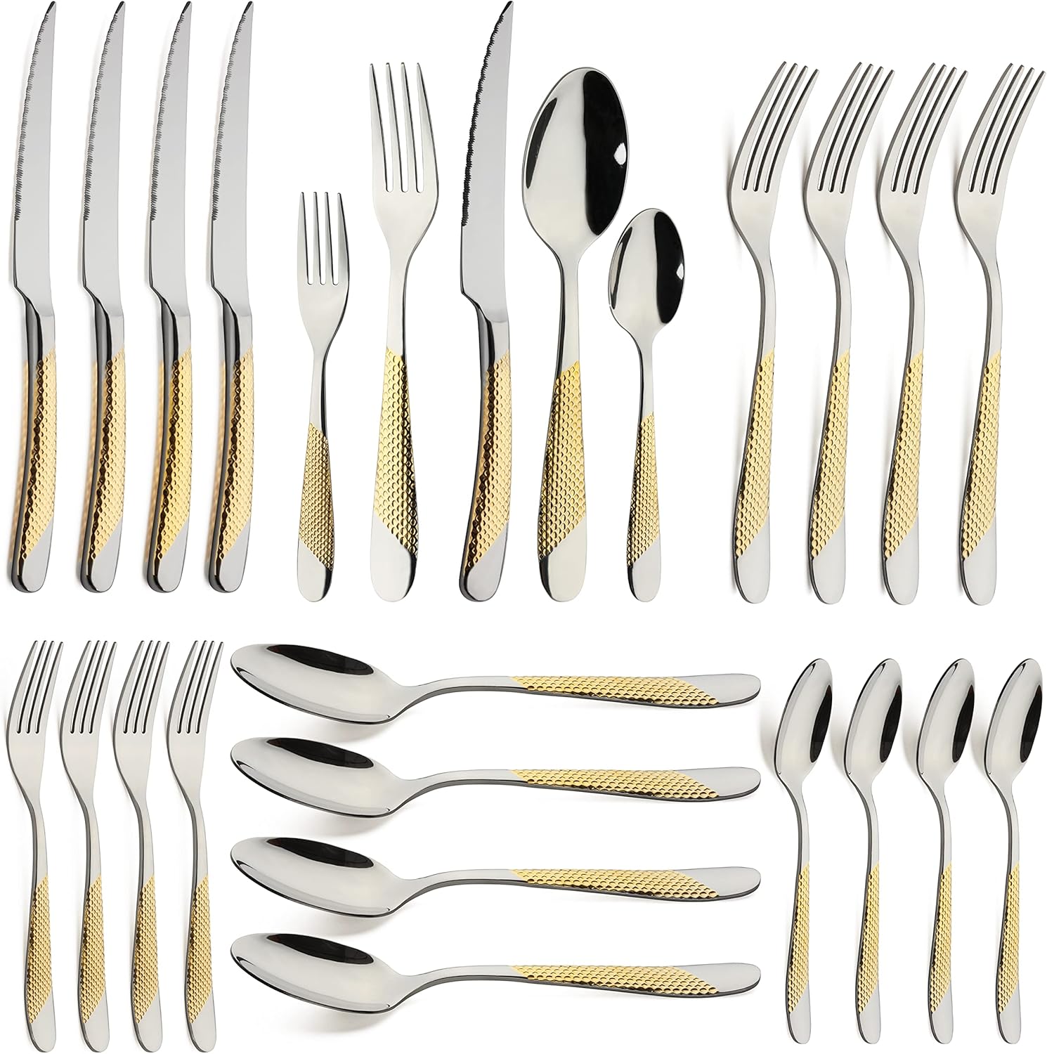 • 【Simple Desgin】The embossed pattern on the handle is a major feature of this cutlery set.The gold-plated process is adopted. The concave-convex pattern makes you not slippery in use. The design of the whole set of flatware looks simple and fashionable.