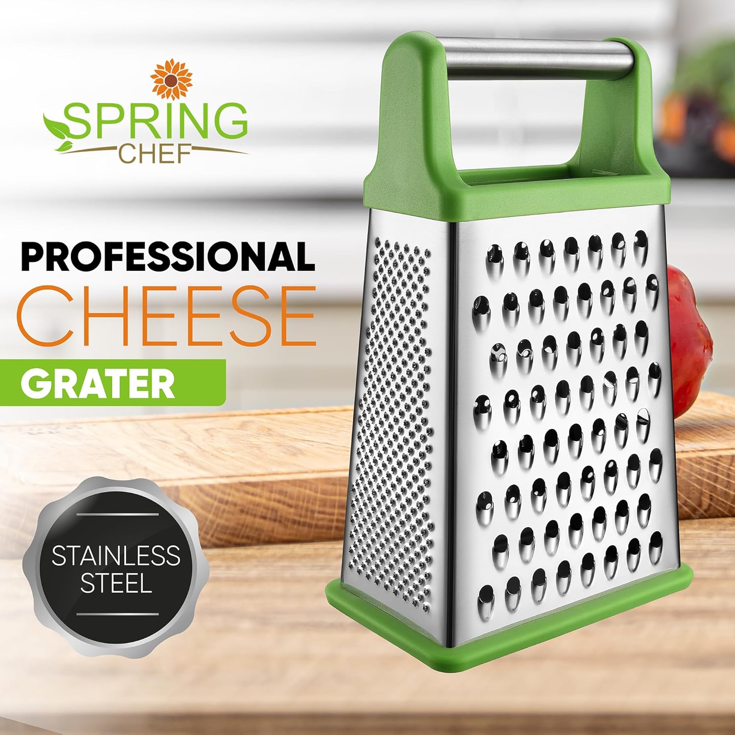 Spring Chef Green Professional Stainless Steel XL Parmesan Cheese Grater with Handle - 4 Sided Box Grater for Kitchen - Dishwasher Safe Food Shredder for Carrot, Potato, Vegetables, Ginger, Hash Brown