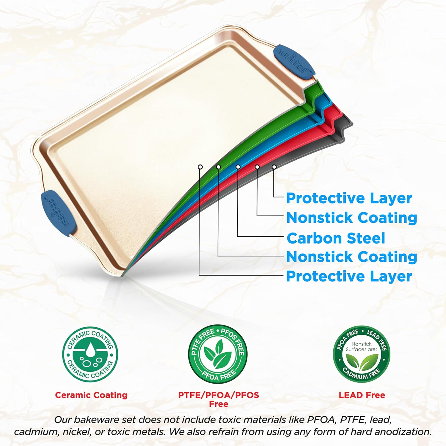 • HEATPROOF SILICONE HANDLES:The commercial grade restaurant quality kitchen bakeware features blue silicone handles to prevent accidental burns. Also stain-resistant, easy to clean & dishwasher safe but hand washing is recommended to extend pan life