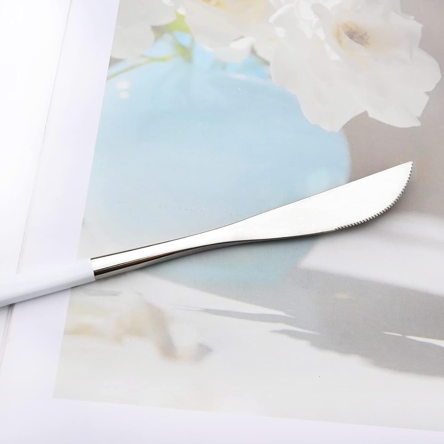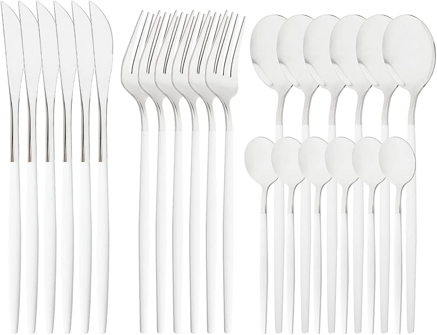 Mirror Cutlery Serving Set, 24-piece 18/0 Stainless Steel Silverware With White Handle Simple & Modern Tableware For Home Party Restaurant Christmas Dinner, Service For 6 (White Silver)
