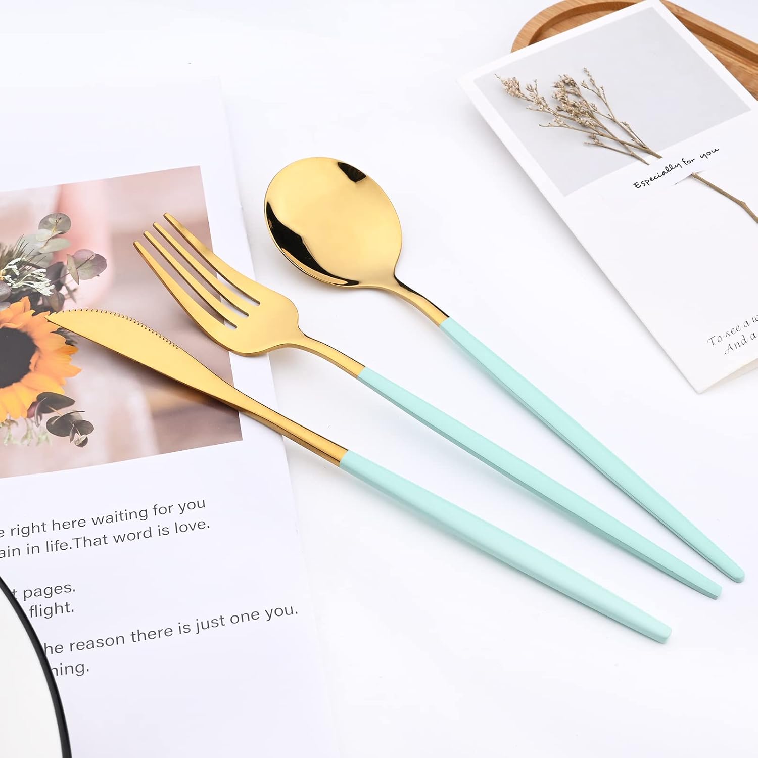 Mirror Cutlery Serving Set, 24-piece 18/0 Stainless Steel Silverware With Mint Green Handle Simple & Modern Tableware For Home Party Dinner, Service For 6 (Mint Green Gold)