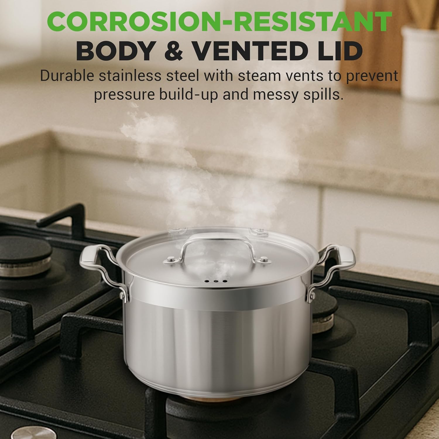 • INDUCTION READY: The heavy duty stainless steel stock pot is designed for safe use in electric, gas, induction, ceramic, hot plate & halogen cook tops. Though dishwasher safe, hand washing is highly recommended to preserve the stainless steel shine