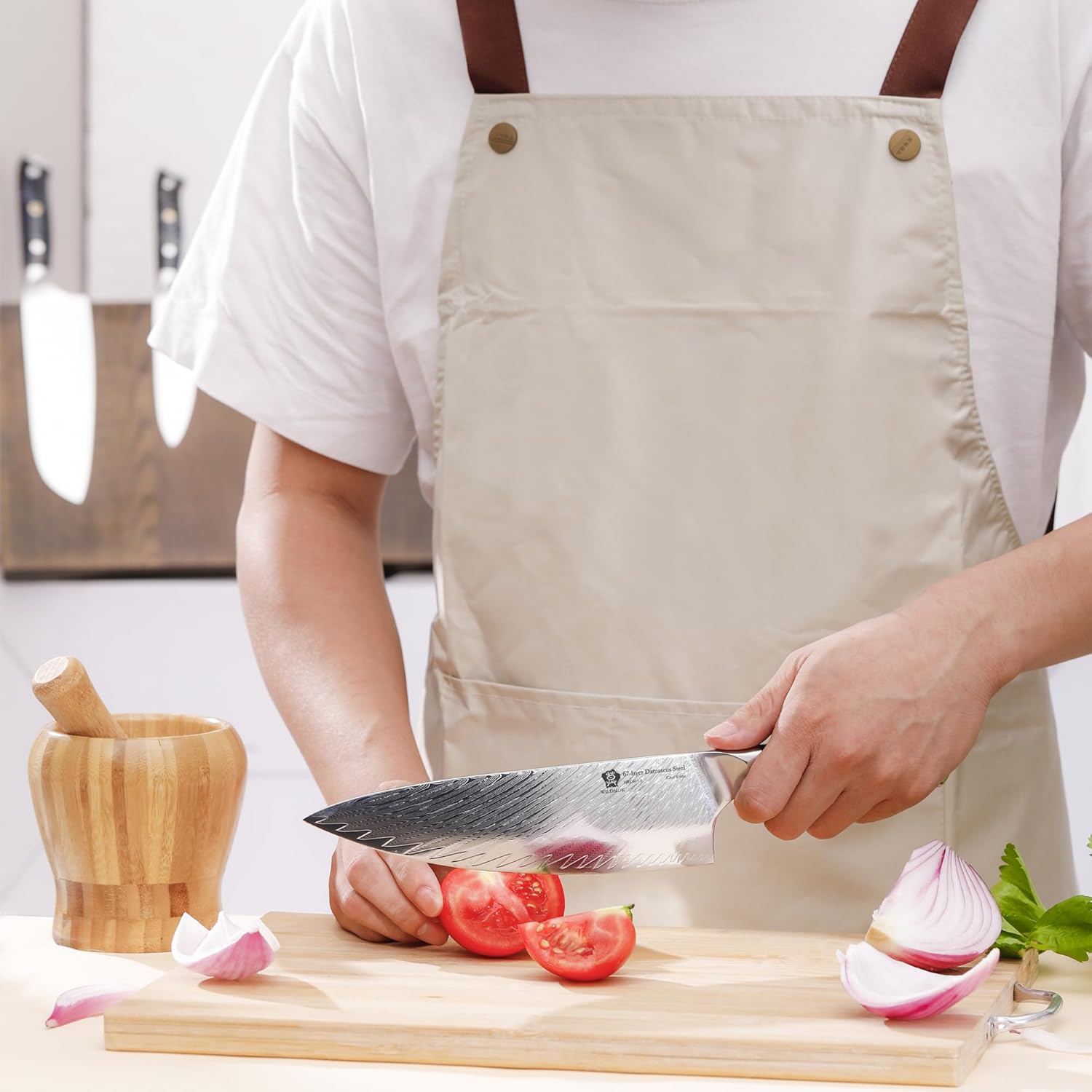 • 【Professional Damascus Chef Knife】WILDMOK chef knife use high quality Japanese 67 layers damascus steel, professional 8 inch chef knives and best gifts for chefs kitchen knives. The Rockwell hardness of the cutting core is 60+. The cutting edge is 10-12 degrees, making it useful for good edge strength while maintaining excellent sharpness.
