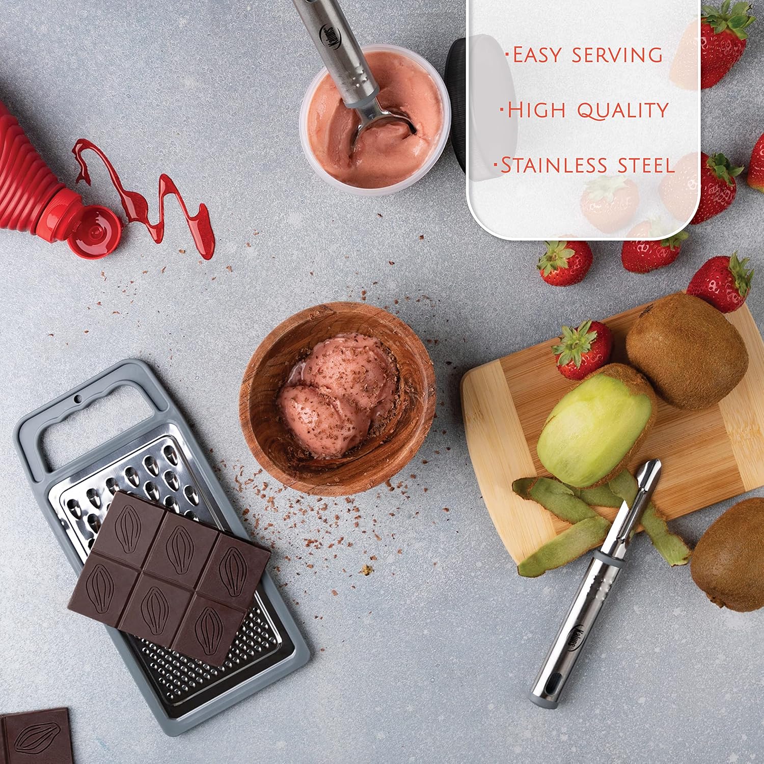 • COOKING UTENSILS SET INCLUDES: Soup Ladle, Solid Spoon, Slotted Spoon, Solid Turner, Slotted Turner, Potato Pusher, Whisk, Grater, Spatula, Tongs, Ice scream Scooper, Measuring Cups, Measuring Spoons, 2 Dough Scrapers, 12 Hanging Hooks And a Beautiful Gift Box.