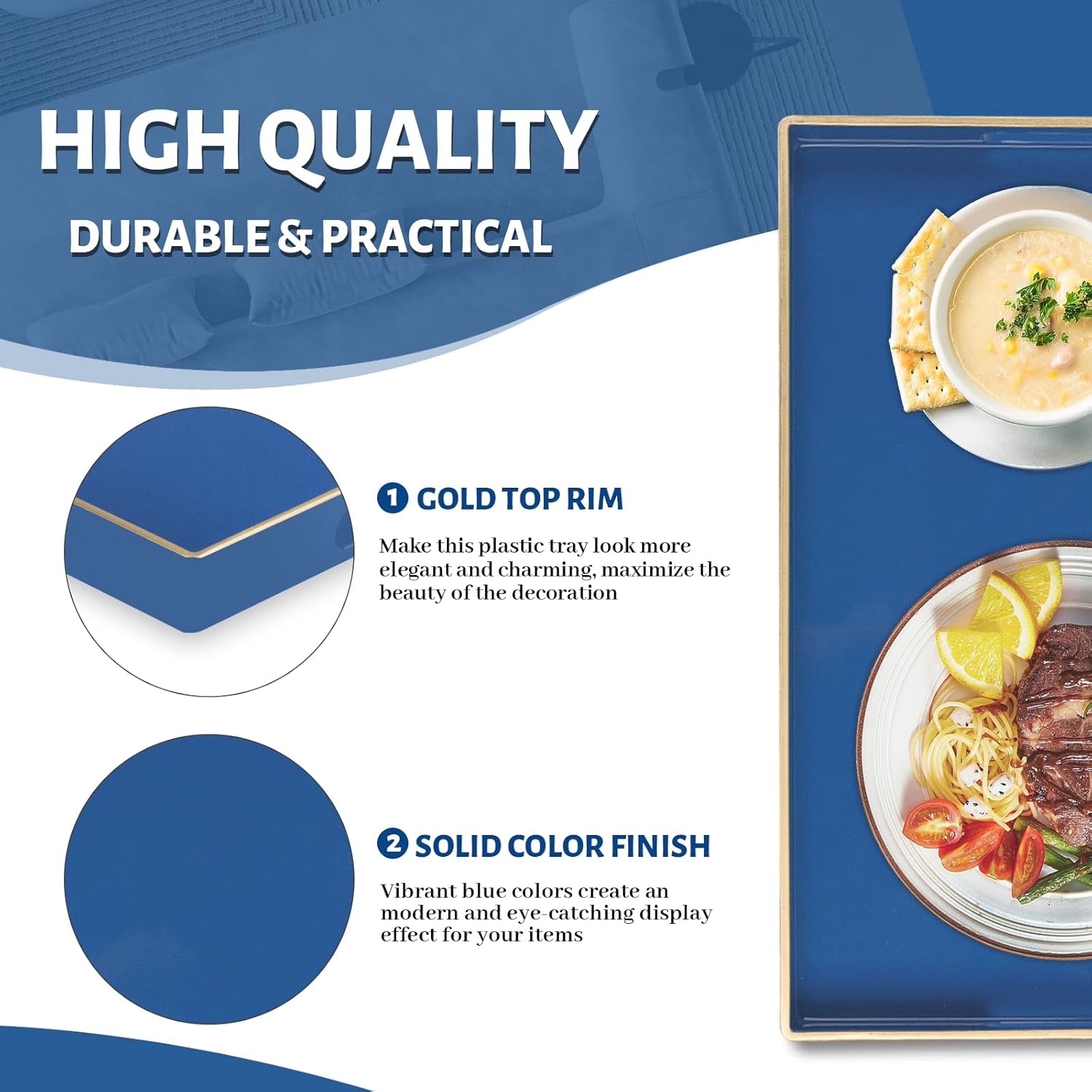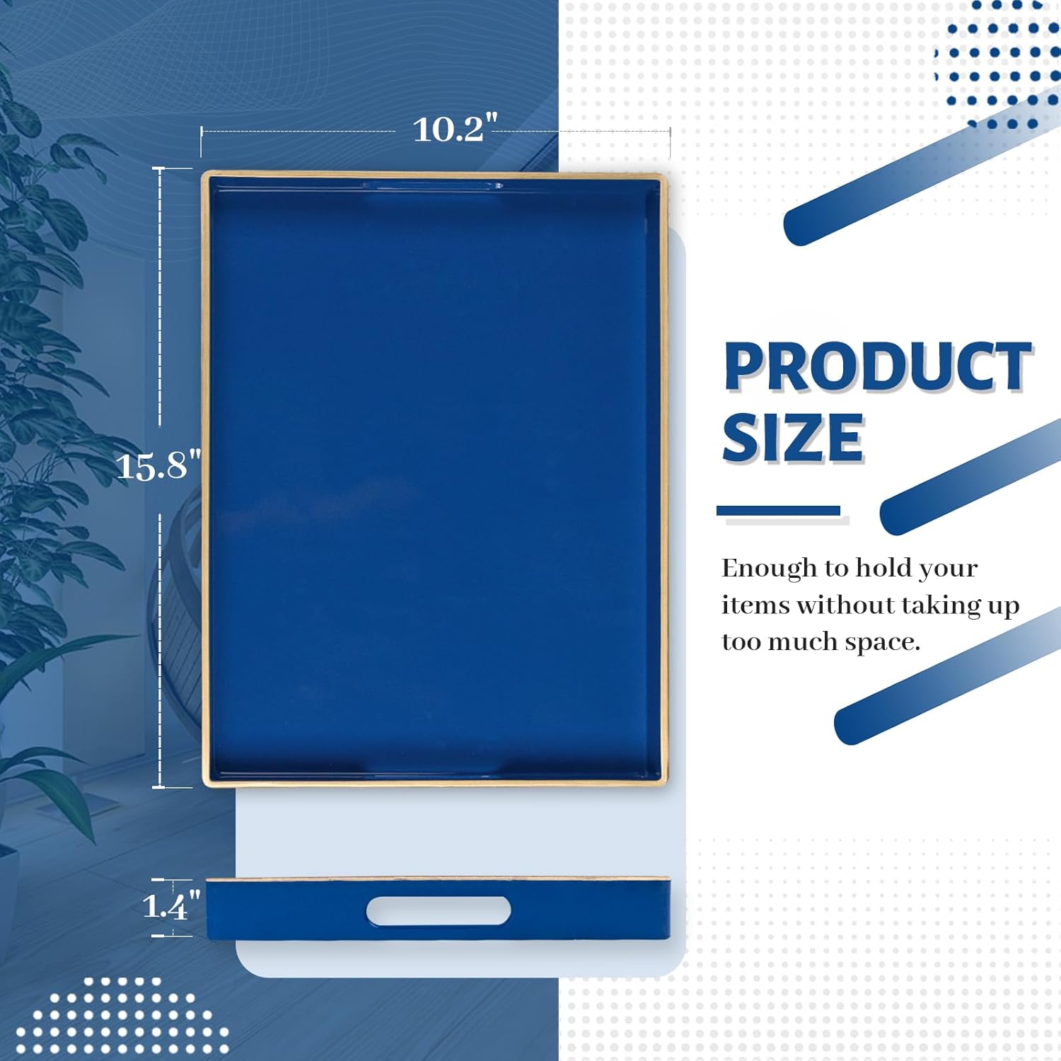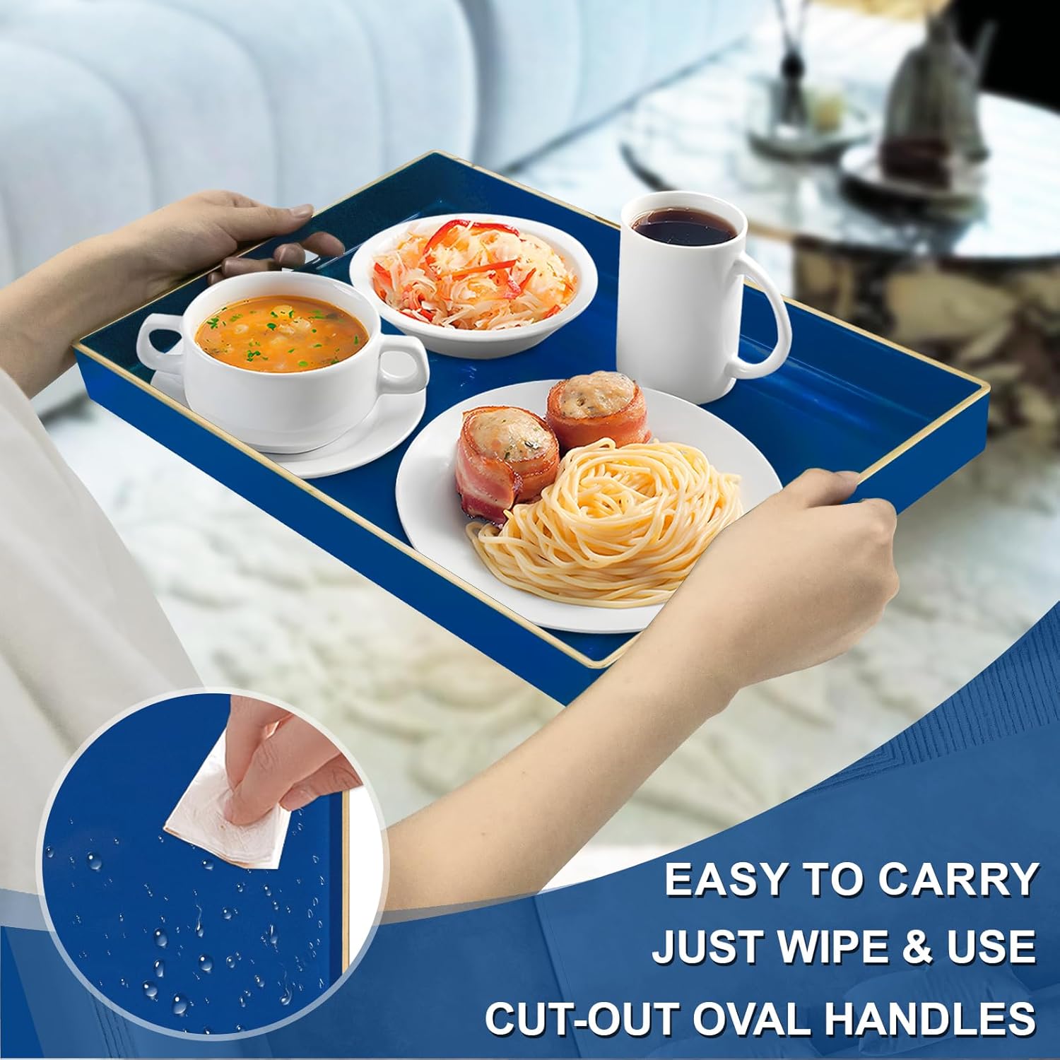 • TRAY DECOR: Navy blue tray is often used to present food and drinks in an appealing and organized manner. Rectangle tray can enhance the visual appeal of the items being served, making them more enticing to guests or customers. Also place it on your bathroom vanity as an exquisite showcase for perfumes, jewelry, or bath accessories.