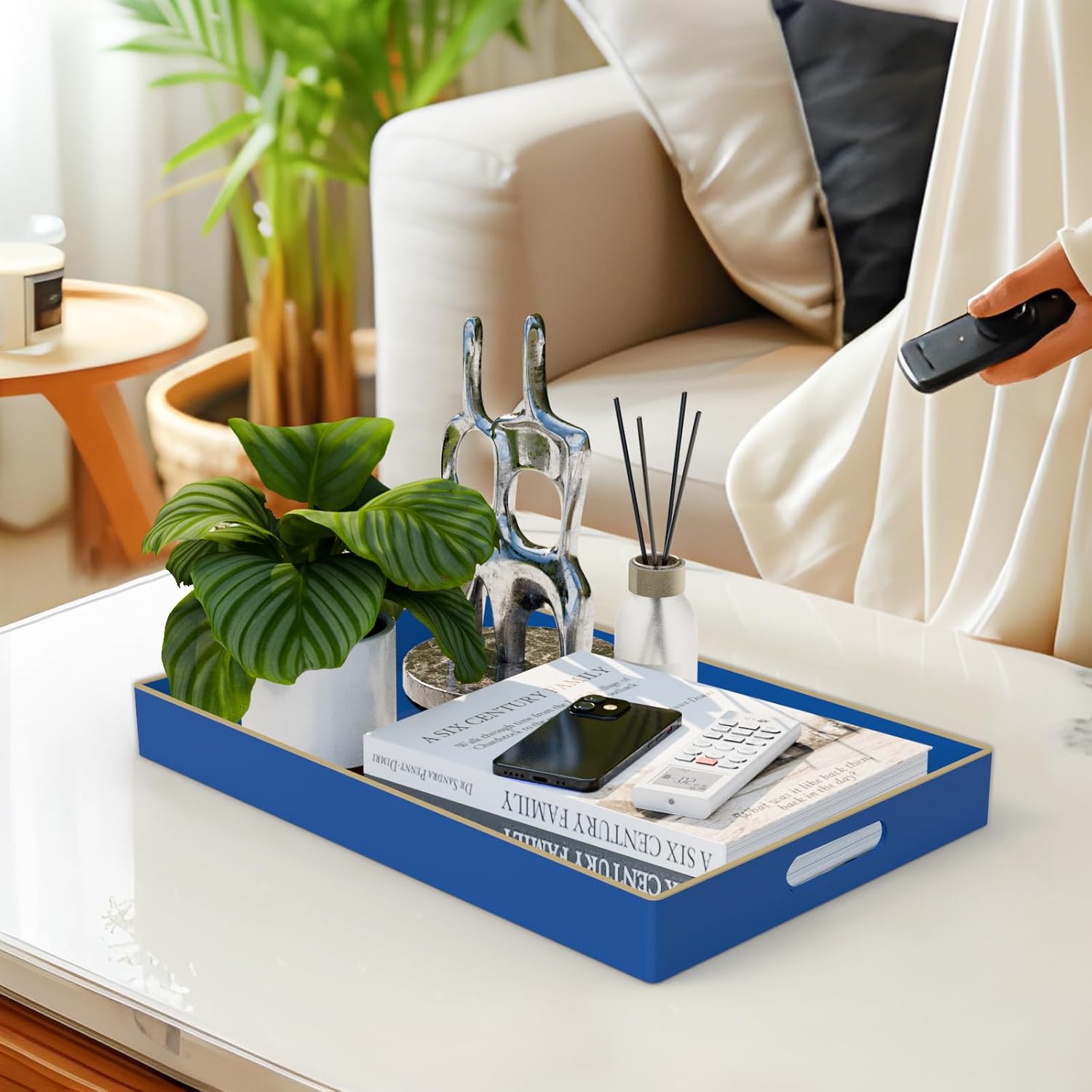 • EASY TO CLEANING: Coffee table tray featuring a classic rectangle design with a navy blue glossy finish and golden top edging, brings a elegance and adds a beautiful touch. Modern blue serving tray has a smooth surface that is waterproof and easy to clean, just use a damp cloth to clean.