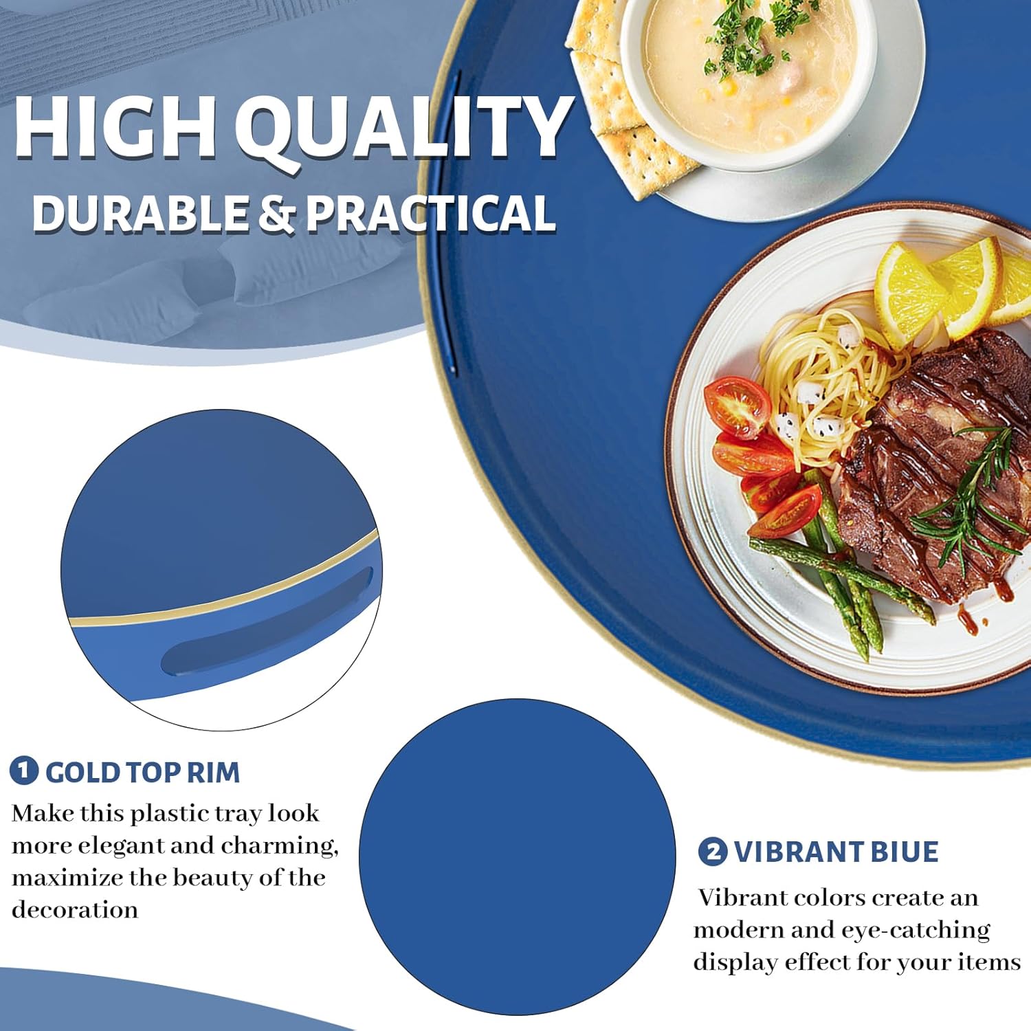 • TRAY DECOR: Blue tray is often used to present food and drinks in an appealing and organized manner. Round table tray can enhance the visual appeal of the items being served, making them more enticing to guests or customers. Also place it on your bathroom vanity as an exquisite showcase for perfumes, jewelry, or bath accessories.