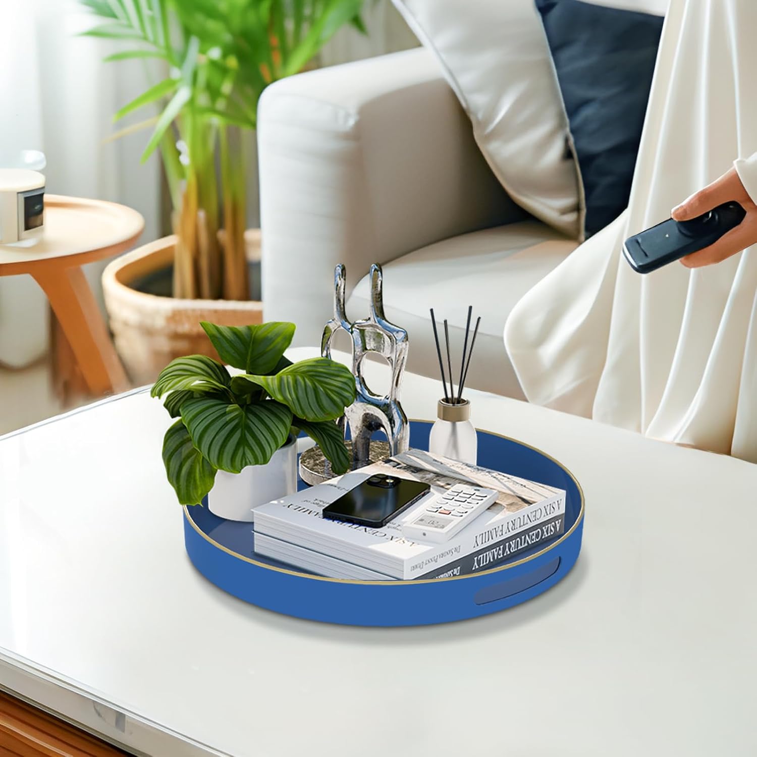 • EASY TO CLEANING: Coffee table tray featuring a classic round design with a navy blue glossy finish and golden top edging, brings a elegance and adds a beautiful touch. Modern blue serving tray has a smooth surface that is waterproof and easy to clean, just use a damp cloth to clean.
