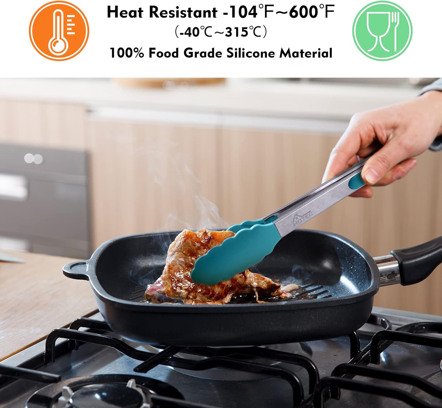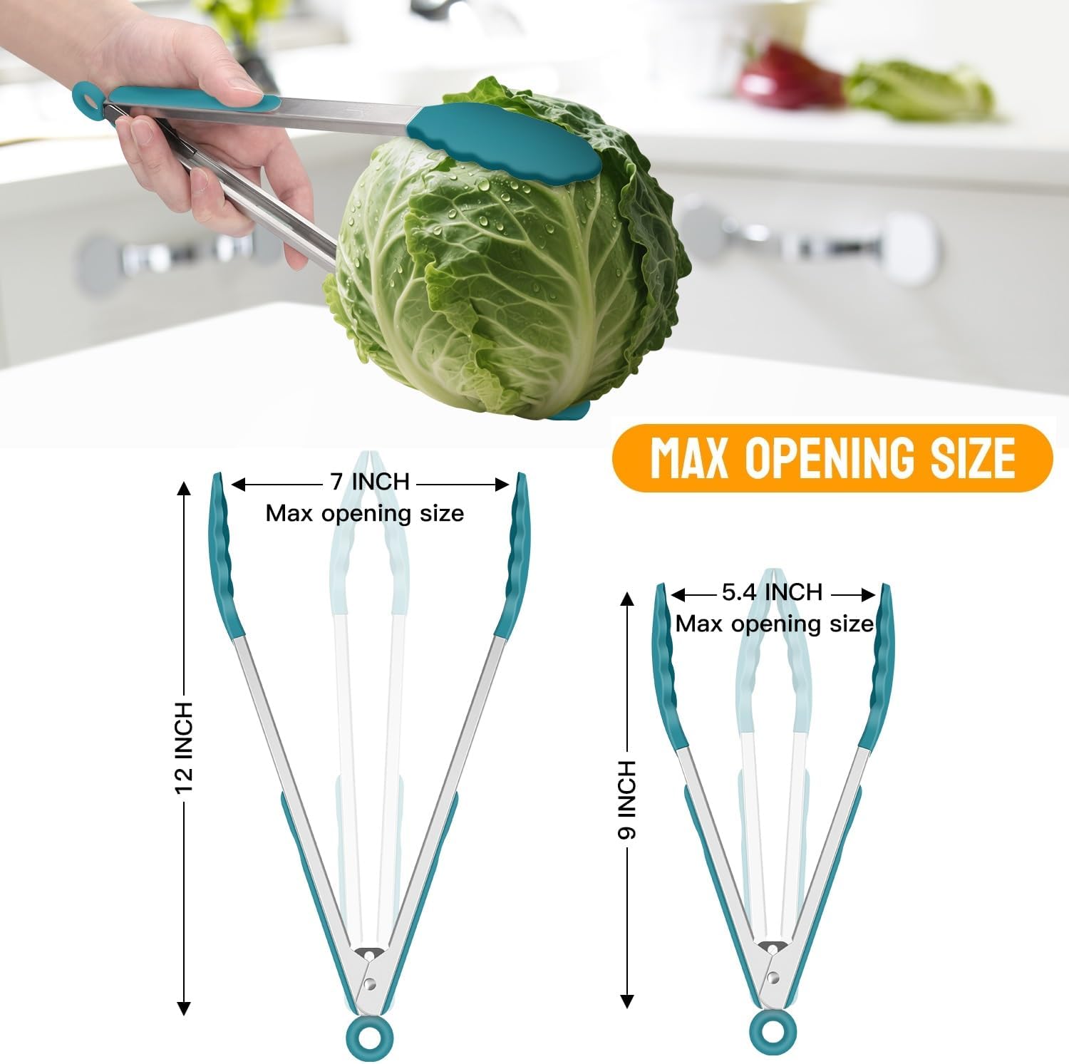 HOTEC Premium Stainless Steel Locking Kitchen Tongs with Silicon Tips, Set of 2-9" and 12", Turquoise