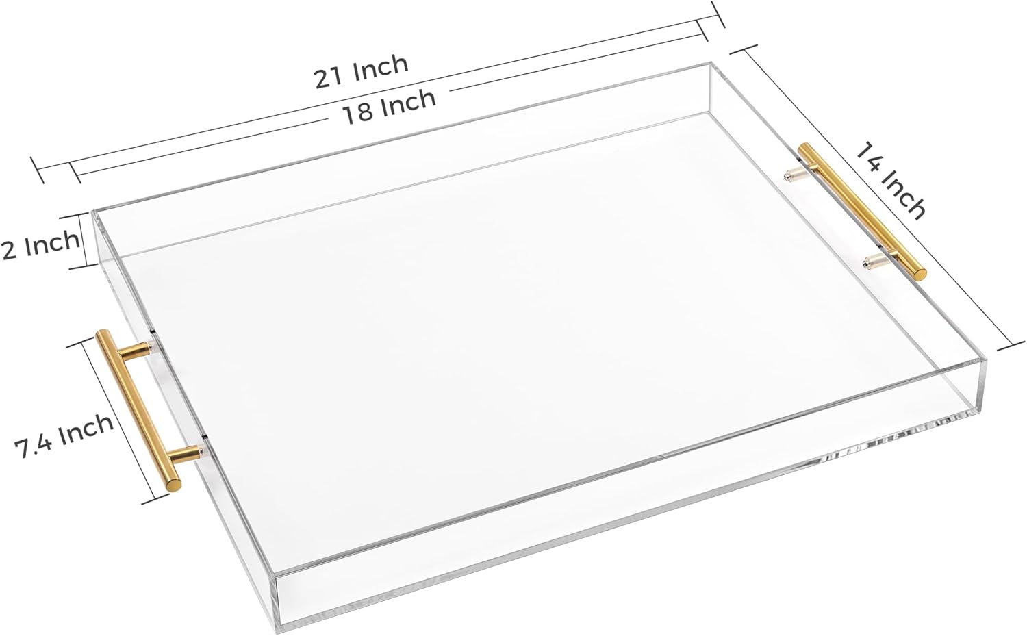 Large Clear Acrylic Serving Tray (14×18 Inches) with Gold Handles Spill Proof Acrylic Decorative Tray Organiser for Ottoman Coffee Table Countertop