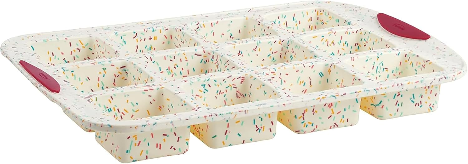 Trudeau Brownie Pan – White Confetti/Fuchsia, 12 Cavity Nonstick Bakeware for Brownies, Mini Cakes, Muffins, Dessert Bars, Easy Release, Dishwasher Safe
