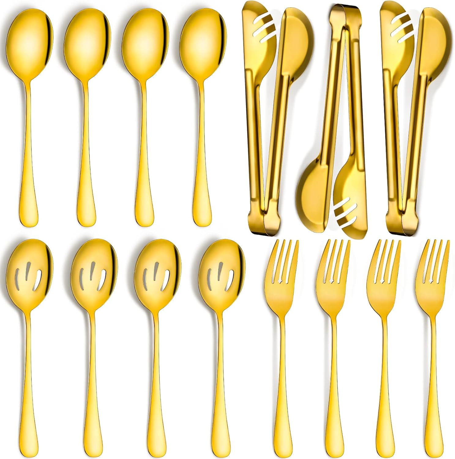 • Package includes: you will receive 15 pieces stainless steel serving utensils in total, including 3 pieces 9.45 inch tongs, 4 pieces 8.7 inch slotted serving spoons, 4 pieces 8.7 inch serving spoons and 4 pieces 9 inch serving forks, abundant quantity and chooses to satisfy your family daily application