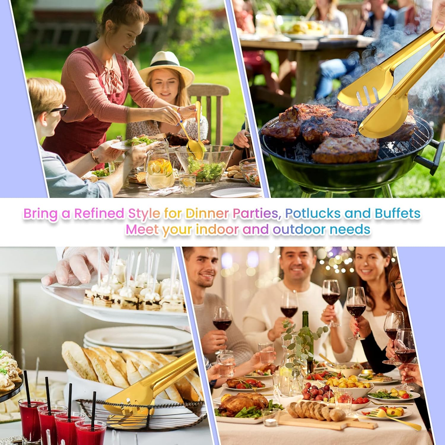 • Multiple uses: the practical tongs are applicable for flipping burgers or fish, grilling meat or as salad tongs, the slotted spoon and fork can let liquid pass through while preserving the solid food on the top, and the solid spoon without holes are optimal for stirring and serving food with a thick sauce