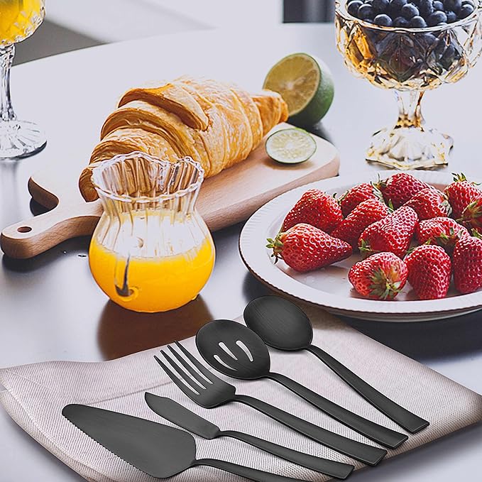 • Serving set of 5, black catering flatware serving set includes serving spoon, slotted serving spoon, serving fork, pie server, butter knife, great additions for your existing tableware or dinnerware set, complete your kitchen cabinet with this set