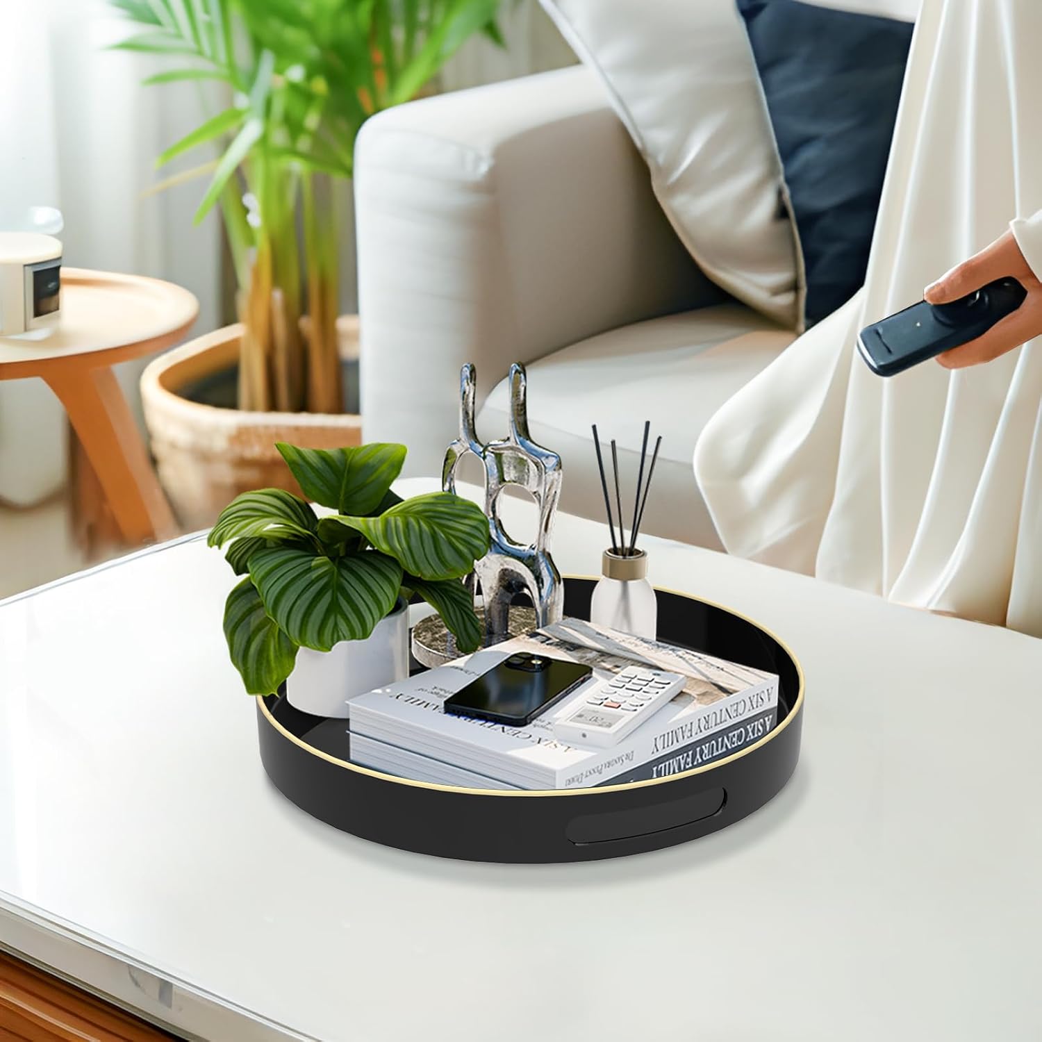 • EASY TO CLEANING: Coffee table tray featuring a classic round design with a black glossy finish and golden top edging, brings a elegance and adds a beautiful touch. Modern black serving tray has a smooth surface that is waterproof and easy to clean, just use a damp cloth to clean.